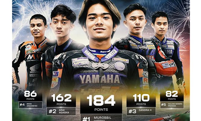 Nah, dua kandidat rider yang berpeluang untuk meraih nasional dalam babak pamungkas ialah M Robby ‘Sakera’ (Yamaha LFN HP969 Global Ondolomon) dan Arai Agaska (Yamaha Niti Racing DRS KYB MFZ Dynavolt HDS Racing). Mereka berbeda 22 poin. Jadi memang Robby “Sakera” yang lebih diuntungkan.