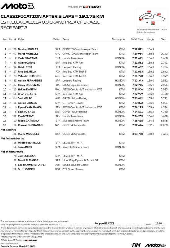 Adapun podium ke-1 dan ke-2 milik duet tim CF Moto Aspar Team, Quiles dan Morelli. BB1