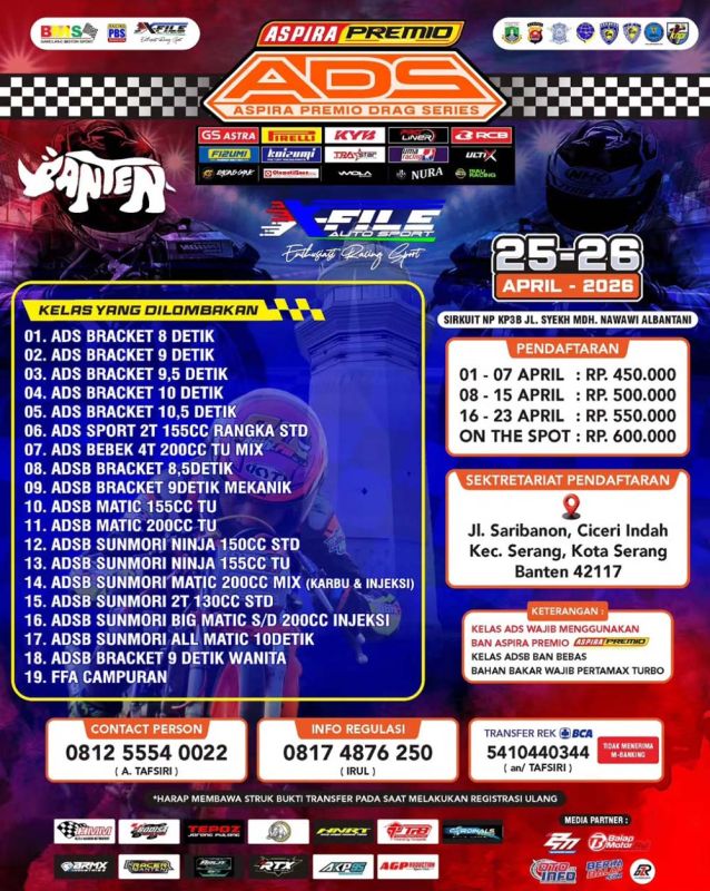 BeritaBalap.com- Balap adu kebut ditrek lurus bertajuk Aspira Premio Drag Series (ADS) 2026 siap menayangkan seri perdanaya di Sirkuit NP KP3B, Serang, Banten, pada 25–26 April 2026. Gelaran tersebut bakal hadir dengan menyuguhkan hadiah yang fantastis.
