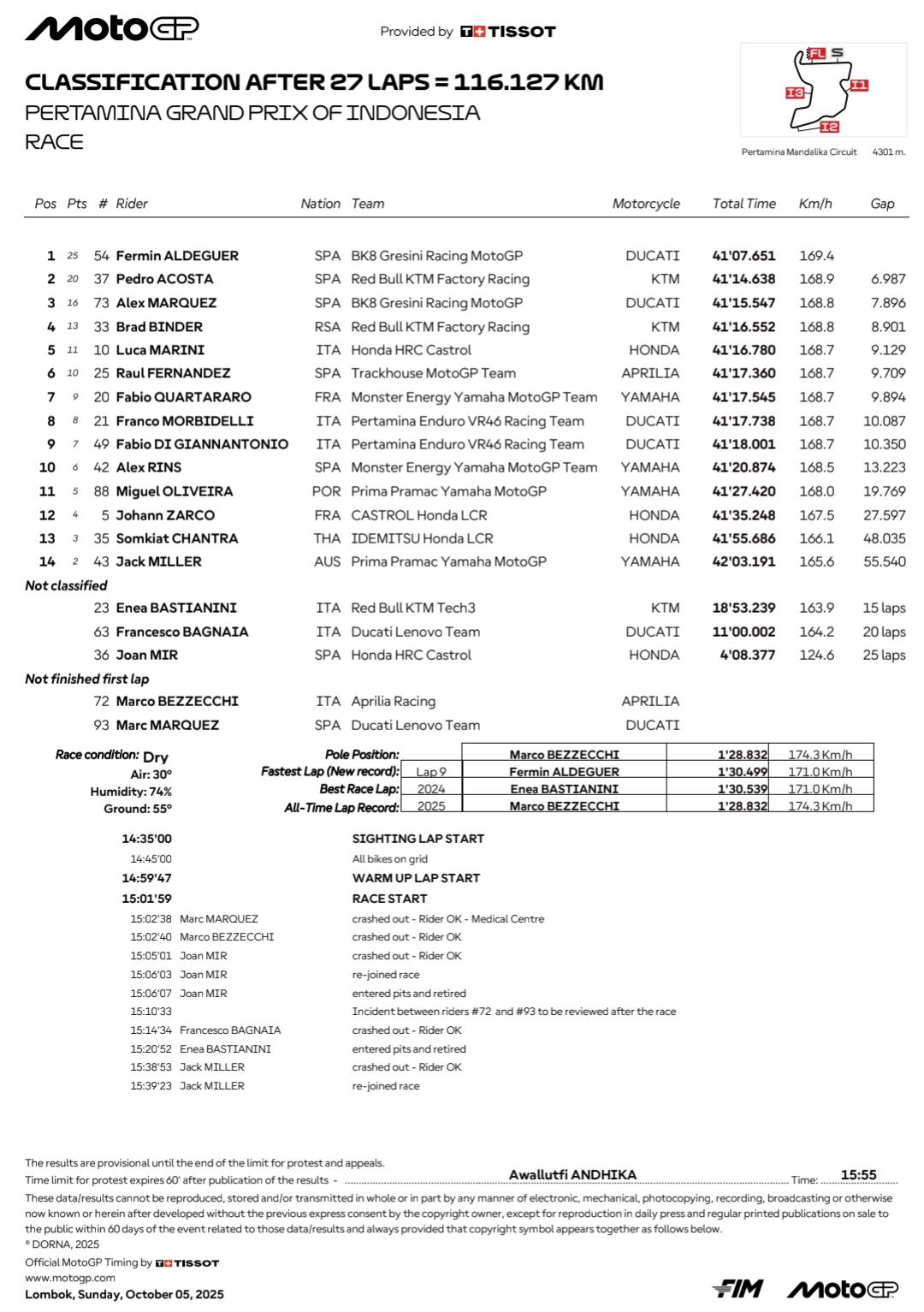 BeritaBalap.com- Fermin Aldeguer merebut podium juara di MotoGP Mandalika, Minggu (5 Okt). Rider tim BK8 Gresini Racing tersebut relatif jauh meninggalkan lawan-lawannya.