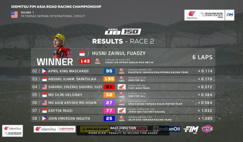 BeritaBalap.com- Pembalap andalan tim Ziear LFN HP969 Adelin MCR RBT34, Alfi Husni, sukses tampil gemilang dengan meraih kemenangan di race 2 kelas UB150 Asia Road Racing Championship (ARRC) 2026 seri pembuka di Sepang, Malaysia, Minggu (12/4).