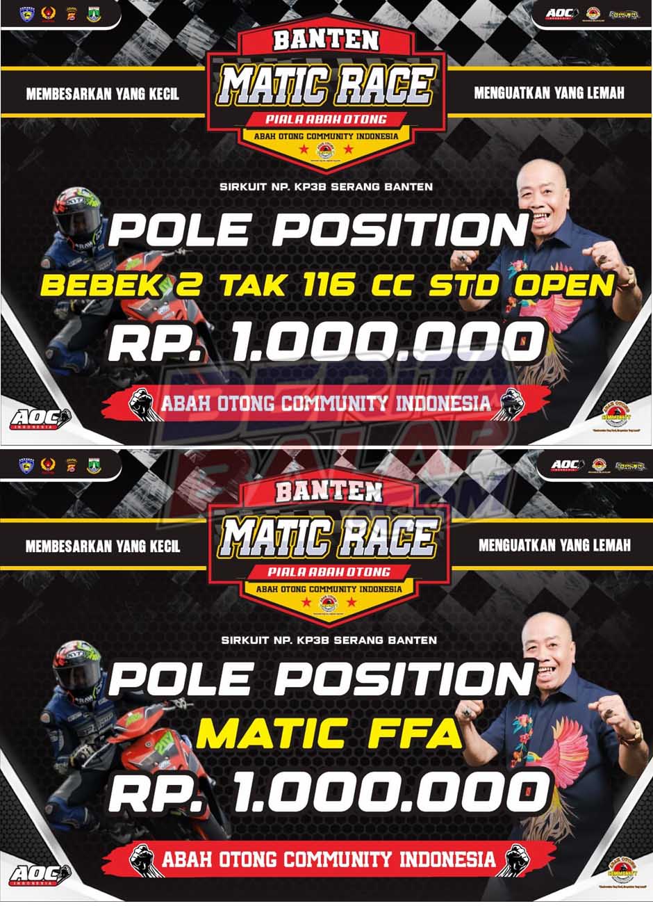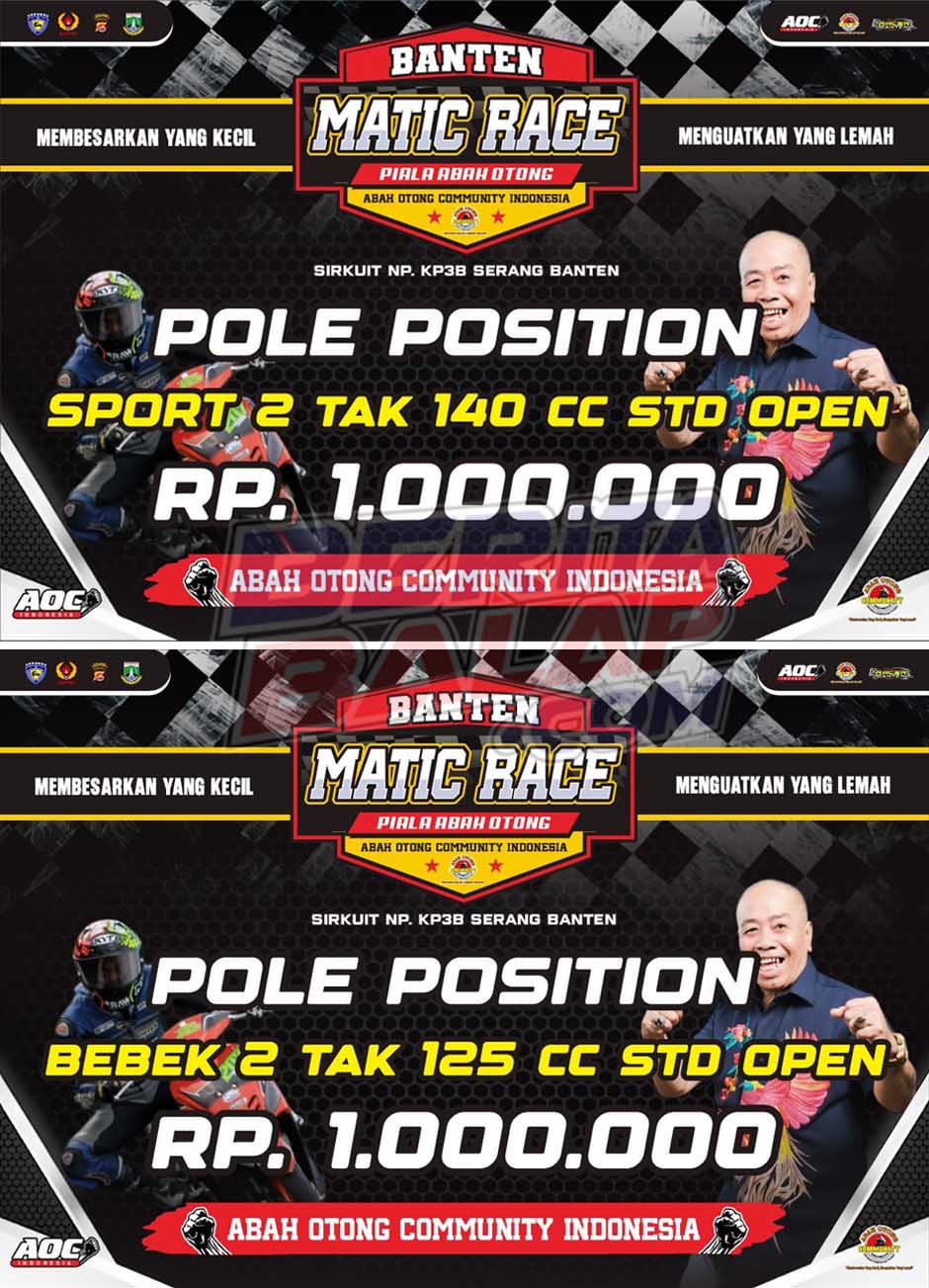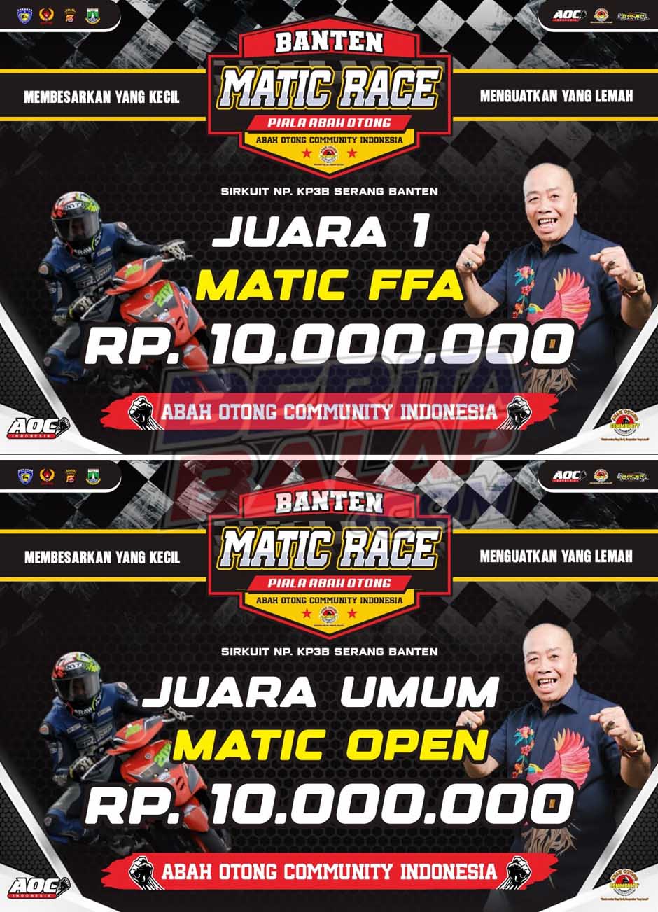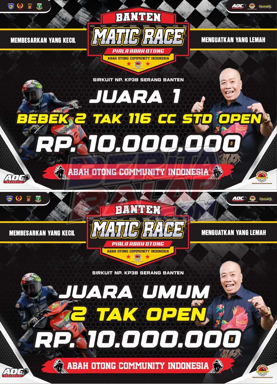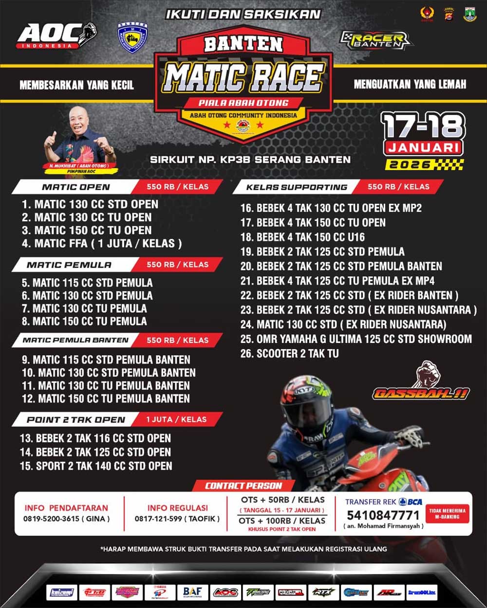 BeritaBalap.com- Wah, bakal menjadi pesta pembuka gelaran balap diawal tahun dengan jaminan banjir hadiah…! Hyupe, hajat balap bertajuk Banten Matic Race Piala Abah Otong 2026 siap hadir dilintasan NP KP3B Serang pada 17-18 Januari dengan seabreg hadiah.