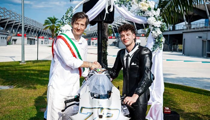 BeritaBalap.com- Marco Bezzecchi memperpanjang jontrak 2 tahun bersama Aprilia Racing di MotoGP untuk musim 2027 dan 2028. Menariknya, sesi perpankangan kotrak yang berlangsung disirkuit Sepang, Malaysia (2/2/2026) dilakukan dengan cara menikahi Albarosa.