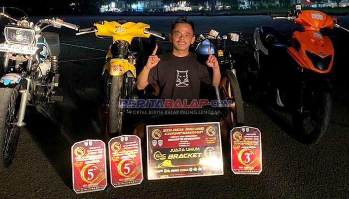 BeritaBalap.com- Enggak sia-sia memboyong 4 motor, Riki Butong berhasil menyabet Juara Umum (JU) Bracket di Golden Racing Championship (GRC) Drag Bike 2026. Tepatnya pada gelaran balap yang telah usai dipentaskan dilintasan non permanen Meikarta Speedway, Cikarang, Bekasi (7-8/3).