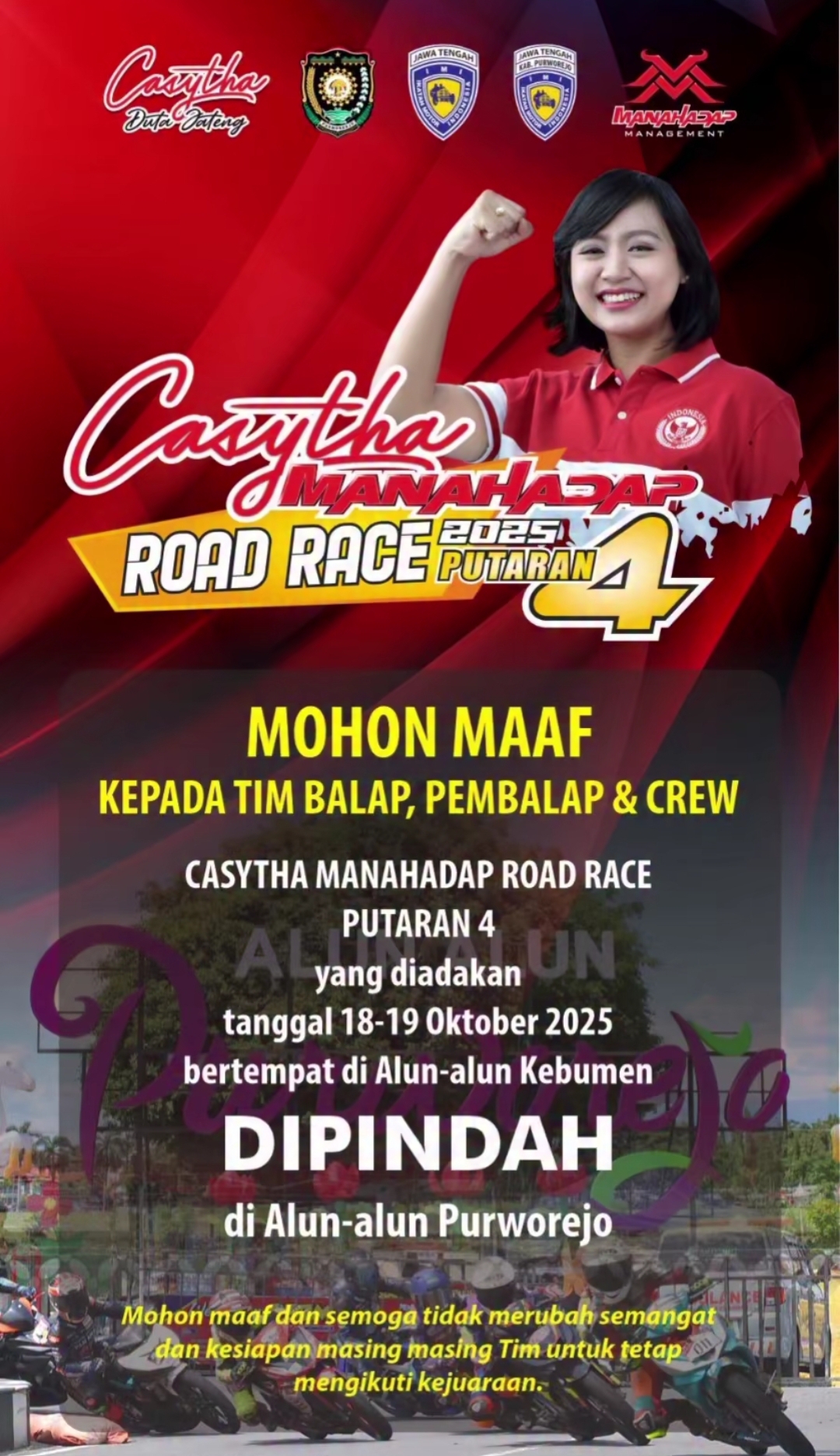 BeritaBalap.com- Fix! Gelaran balap bertajuk Casytha Manahadap Road Race 2025 putaran 4 pindah ke Purworejo. Semula gelaran balap ini akan dilangsungkan di lintasan alun-alun Kebumen pada 18-19 Oktober mendatang.