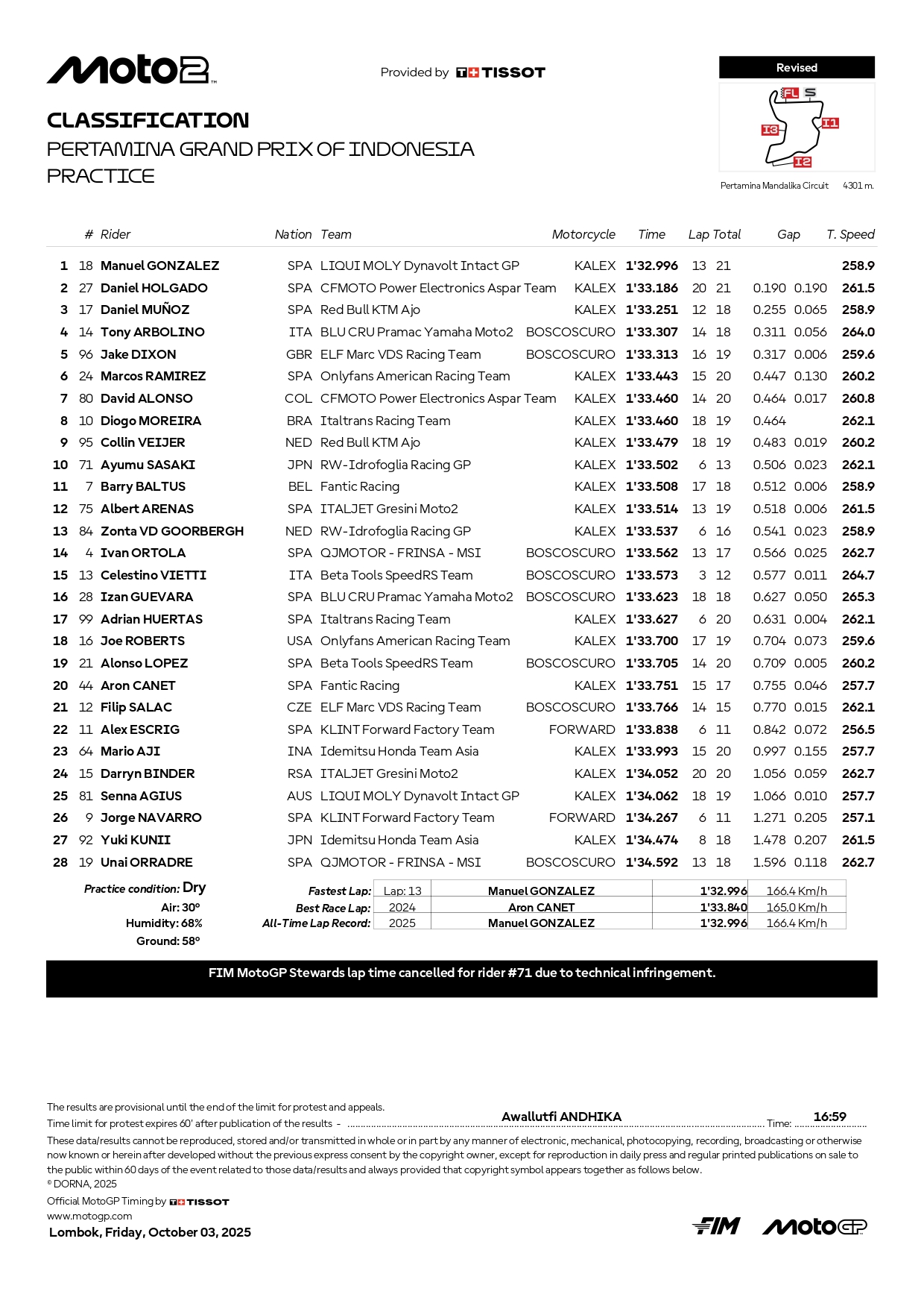 BeritaBalap.com-Pembalap Moto2 asal tanah air Mario Aji berada di posisi ke-23 dalam sesi Practice Moto2 di Sirkuit Mandalika Lombok, Jumat (3 Oktober). Rider Honda Team Asia tersebut memiliki gap waktu hampir 1 detik dengan Manuel Gonzalez (Liqui Moly Dynavolt IntactGP) yang merebut posisi tercepat. Tepatnya mereka berjarak 0,997 detik.