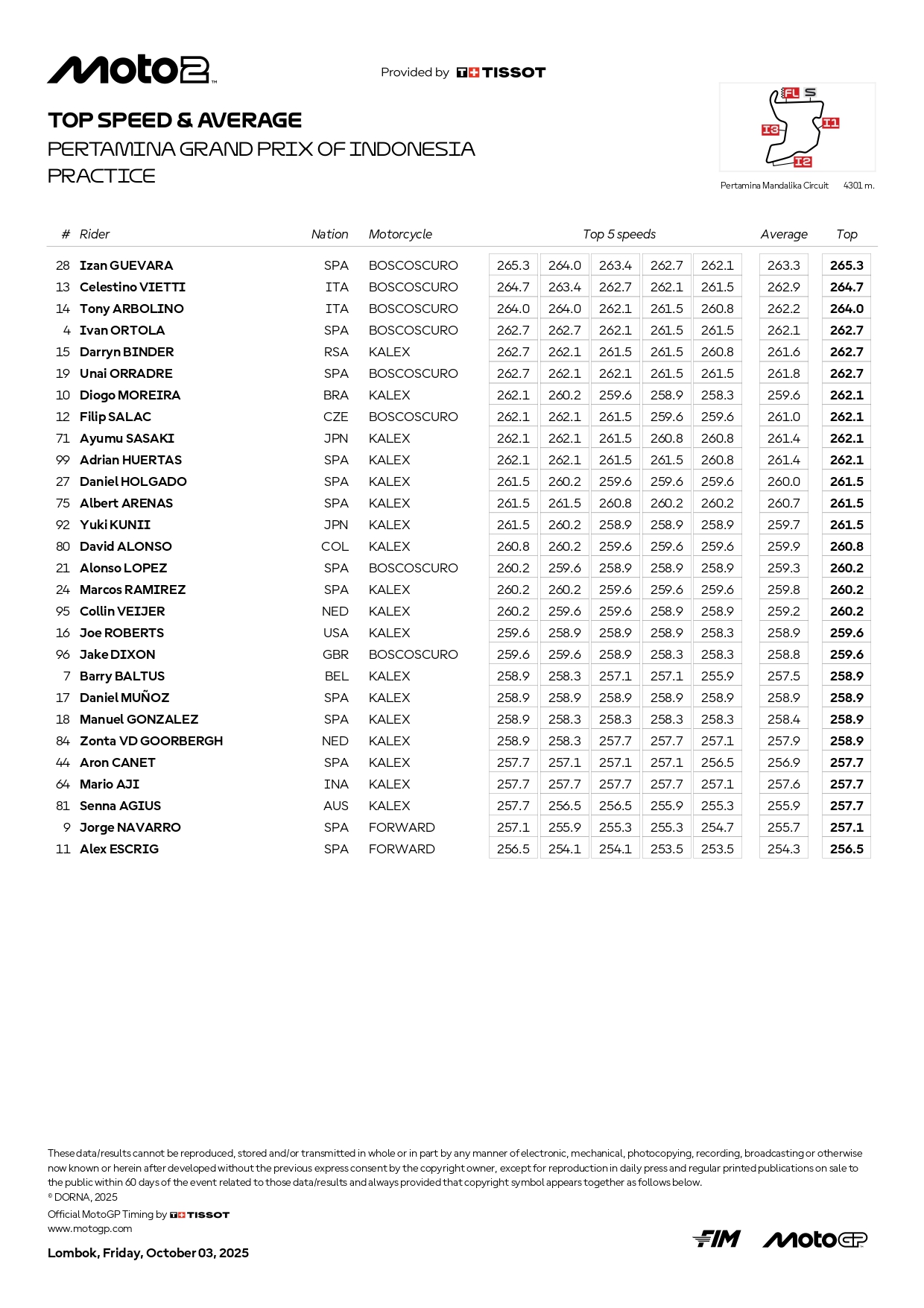 Ternyata memang pacuan Mario Aji berada di deretan bawah dalam pencapaian top speed yang menorehkan 257,7 Km/Jam. Itu di urutan ke-24 dari total 28 starter yang ambil bagian. Dan jika dibandingkan dengan top speed tertinggi milik Izan Guevara yang 265,3 Km/Jam, maka berbeda 7,6 Km/jam. Begitu signifikan ya untuk balapan yang berlangsung sekira 22 lap. BB1 (Ket FOTO : Honda Team Asia).