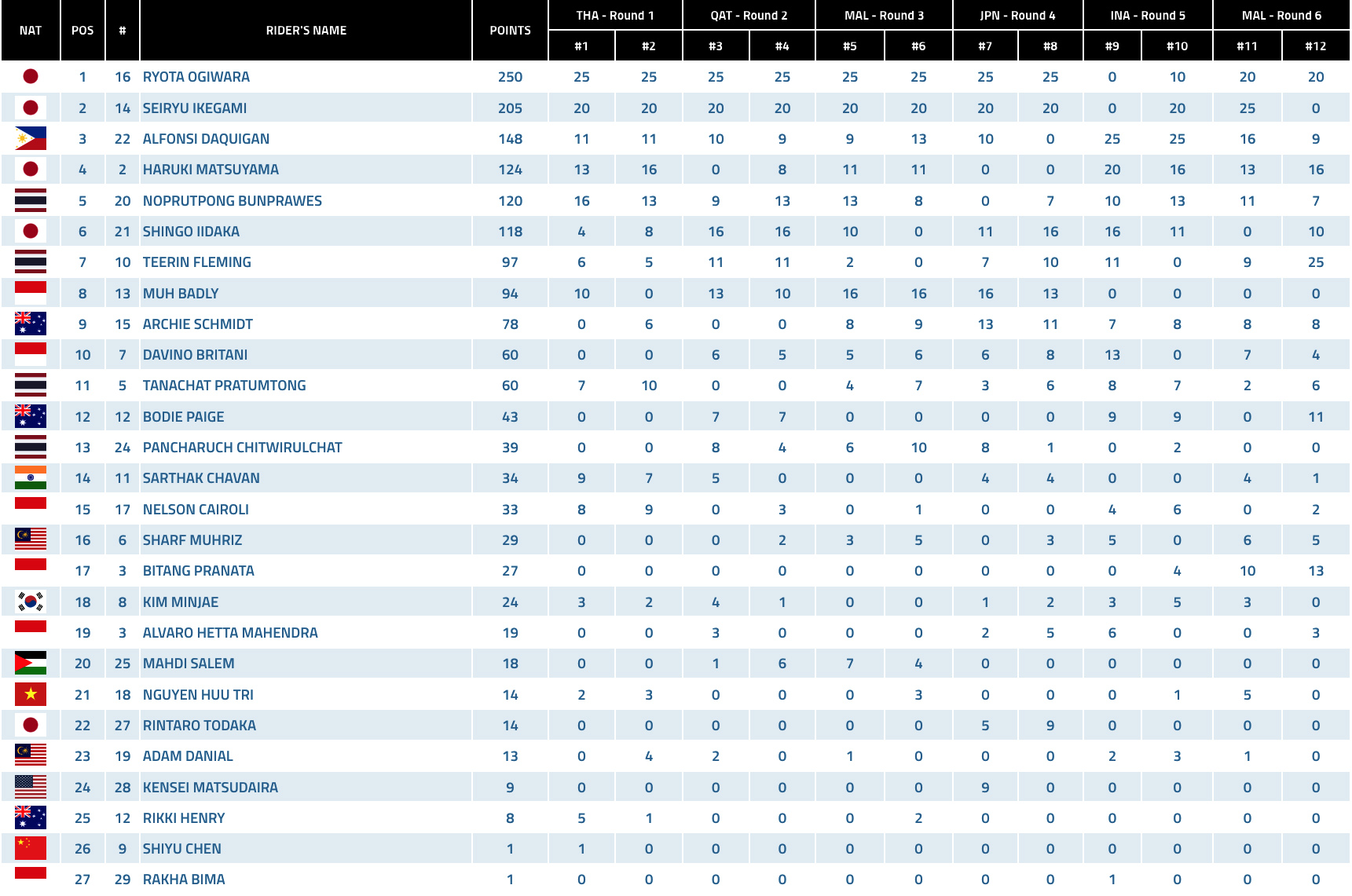 Total ada 19 pembalap yang terpilih dan ini berasal dari 6 negara. Tercatat 3 nama pembalap Indonesia, mulai Bintang Pranata Sukma, kemudian Muh Badly dan Maulana Malik.