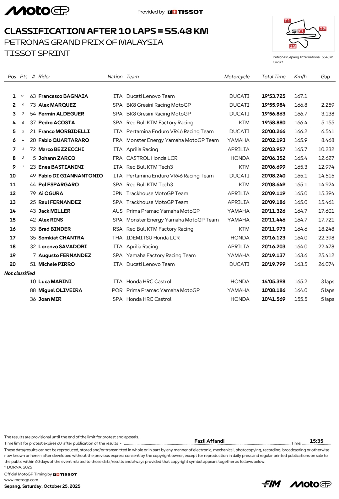 Makin sempurna lagi ketika melakukan start dengan baik, terus memimpin balapan sprint race Sabtu (25 Okt) hingga bendera finish dikibarkan. Berjarak sekira 2.4 detik dari Alex Marquez (BK8 Gresini Racing) yang finish ke-2.