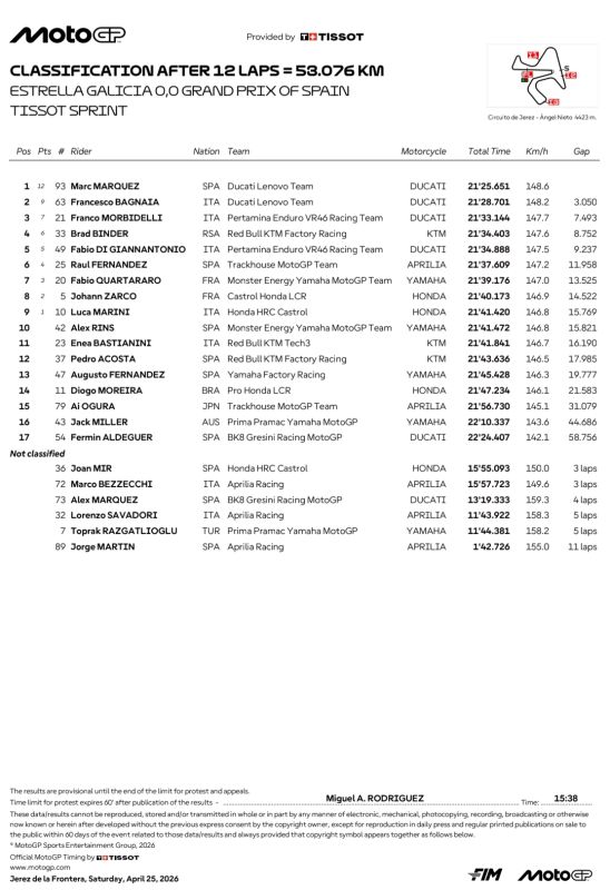 Hasil Sprint Race MotoGP 2026 Spanyol :