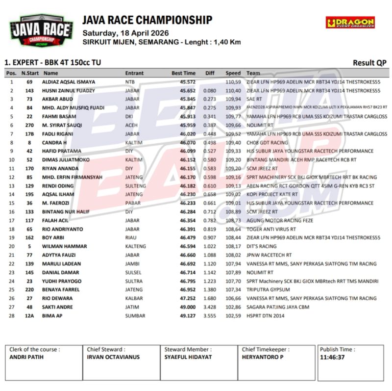 BeritaBalap.com- Wah, mantap nih…! Duo rider Ziear LFN HP969, Aldiaz Aqsal Ismaya dan Alfi Husni bergasil mencatatkan waktu tercepat pada sesi kualifikasi kelas Bebek 4T 150cc TU Expert (MP1) gelaran Java Race Championship (JRC) 2026 Semarang. Ini merupakan putaran pembuka yang berlangsung disirkuit Mijen, Semarang (18/4).