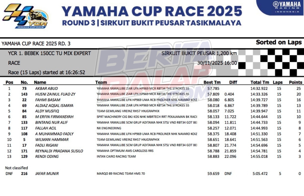 BeritaBalap.com- Dominasi MX King by mekanik Bima Aditya The Strokes55. Itu dalam kelas paling bergengsi Expert MP1 alias YCR1 hajatan Yamaha Cup Race 2025 di Sirkuit Bukit Peusar Tasikmalaya, Minggu (30 Nov).