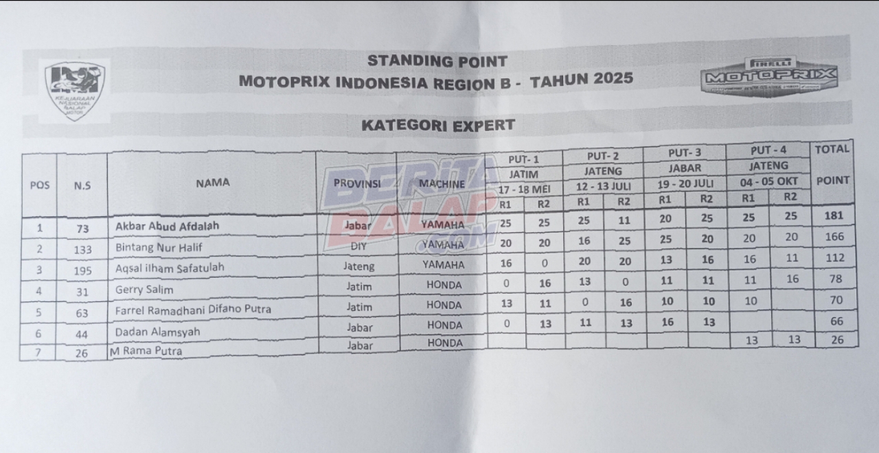 Meski sebelumnya berselisih 5 poin dengan Bintang Nur Halif (Yamaha Aditama), atas hasil sempurna yang didapati, Akbar Abud sukses menyandang gelar juara Nasional Expert Motoprix region B. Klasemen akhirnya, Akbar Abud mengemas 181 poin sementara Bintang Nur Halif diurutan kedua dengan 166 poin.