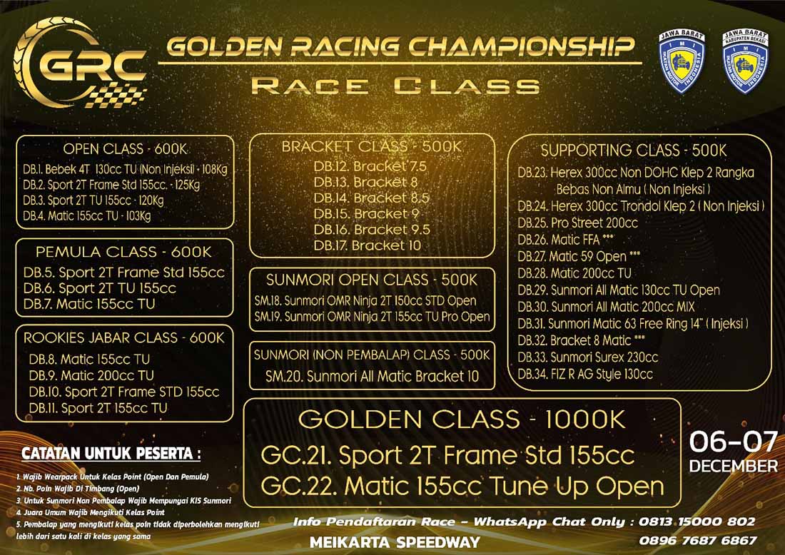 Ada pula Golden Class (Sport 2T Frame Std 155cc dan Matic 155cc TU Open) yang langsung mengganjar dragster tercepat dengan uang pembinaan sebesar Rp 10 juta. Khusus registrasi Golden Class, kalian bisa mendaftarkan diri dengan mengeluarkan kocek Rp 1 juta.