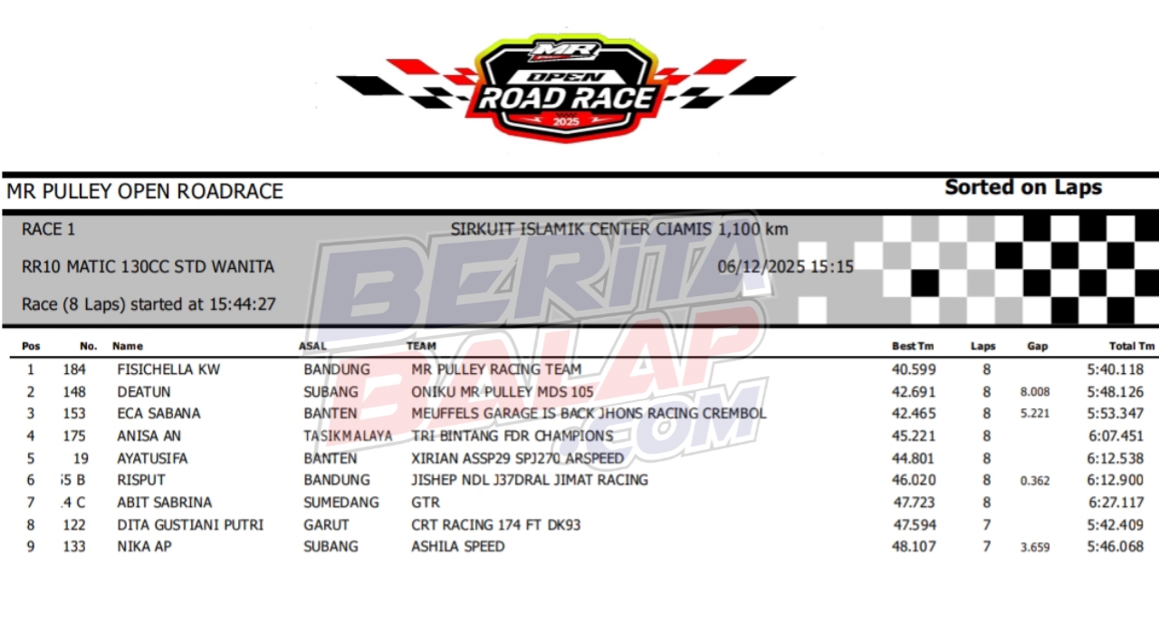 BeritaBalap.com- Fisichella KW tampil dominan pada race 1 kelas Matic Wanita gelaran MR Pulley Open Road Race 2025 yang berlangsung di lintasan NP Islamic Center, Ciamis (6/12). Dominasi Fisichella KW sudah dimulai sejak melakoni sesi babak kualifikasi.