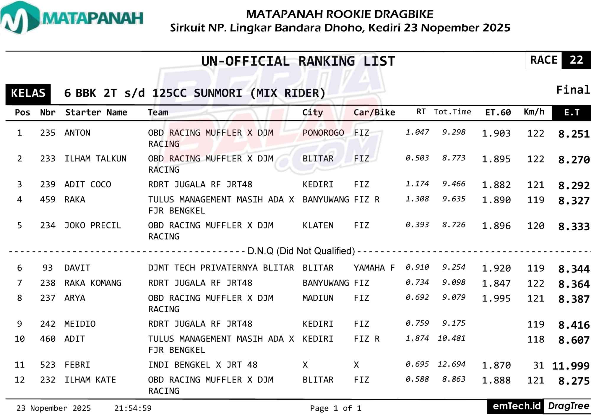 BACA JUGA : Hasil Juara Lengkap Matapanah Rookie Drag Bike 2025 Kediri