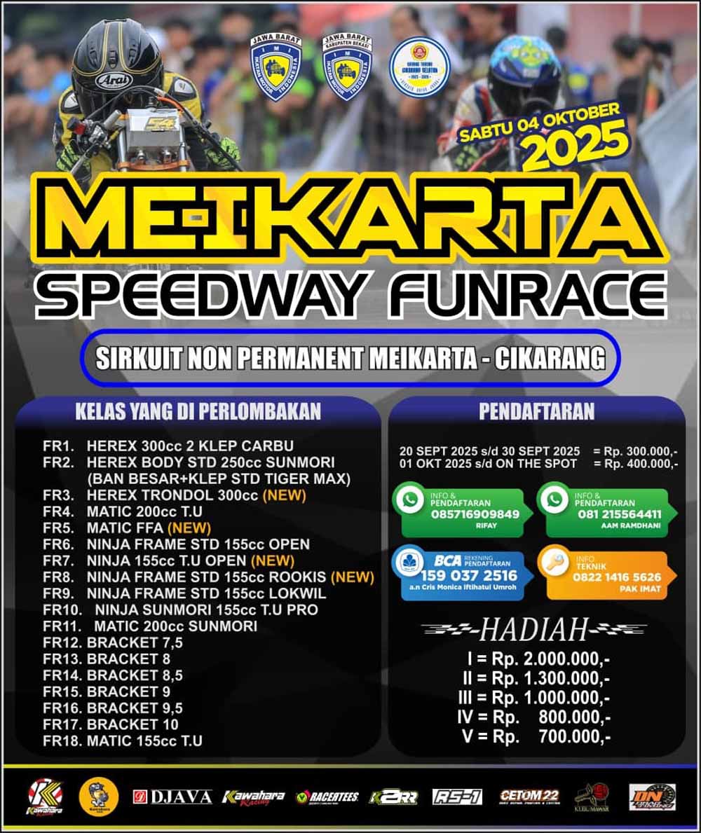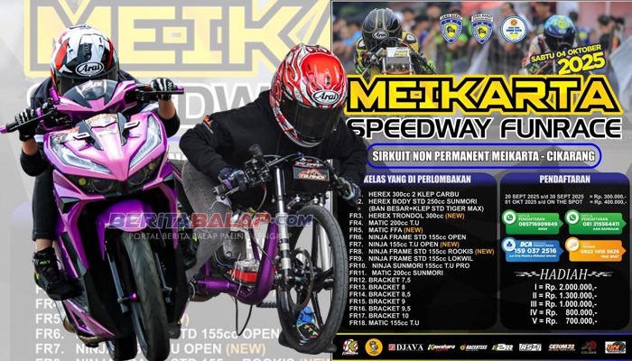 BeritaBalap.com- Buat kalian para pecinta balap adu kebut ditrek lurus, jangan sampai terlewat dengan gelaran event yang hadiahnya menggoda. Hyupe, menyandang titel Meikarta Speedway Funrace Drag Bike 2025, gelaran balap persembahan Jocell ini siap digeber Sabtu, 4 Oktober disirkuit Meikarta, Cikarang.
