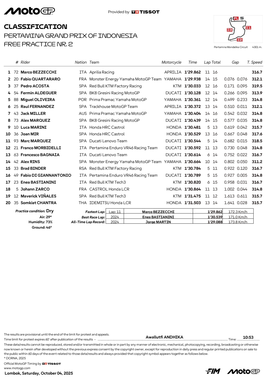 BeritaBalap.com- Rider andalan Aprilia Racing, Marco Bezzecchi berhasil mencatatkan waktu tercepat lagi saat melakoni sesi latihan bebas kedua (FP2) MotoGP Mandalika 2025. Bezzecchi menjadi yang tercepat pada FP2 setelah mencatatkan waktu 1 menit 29,862 detik di Pertamina Mandalika International Circuit, Lombok (4/10).