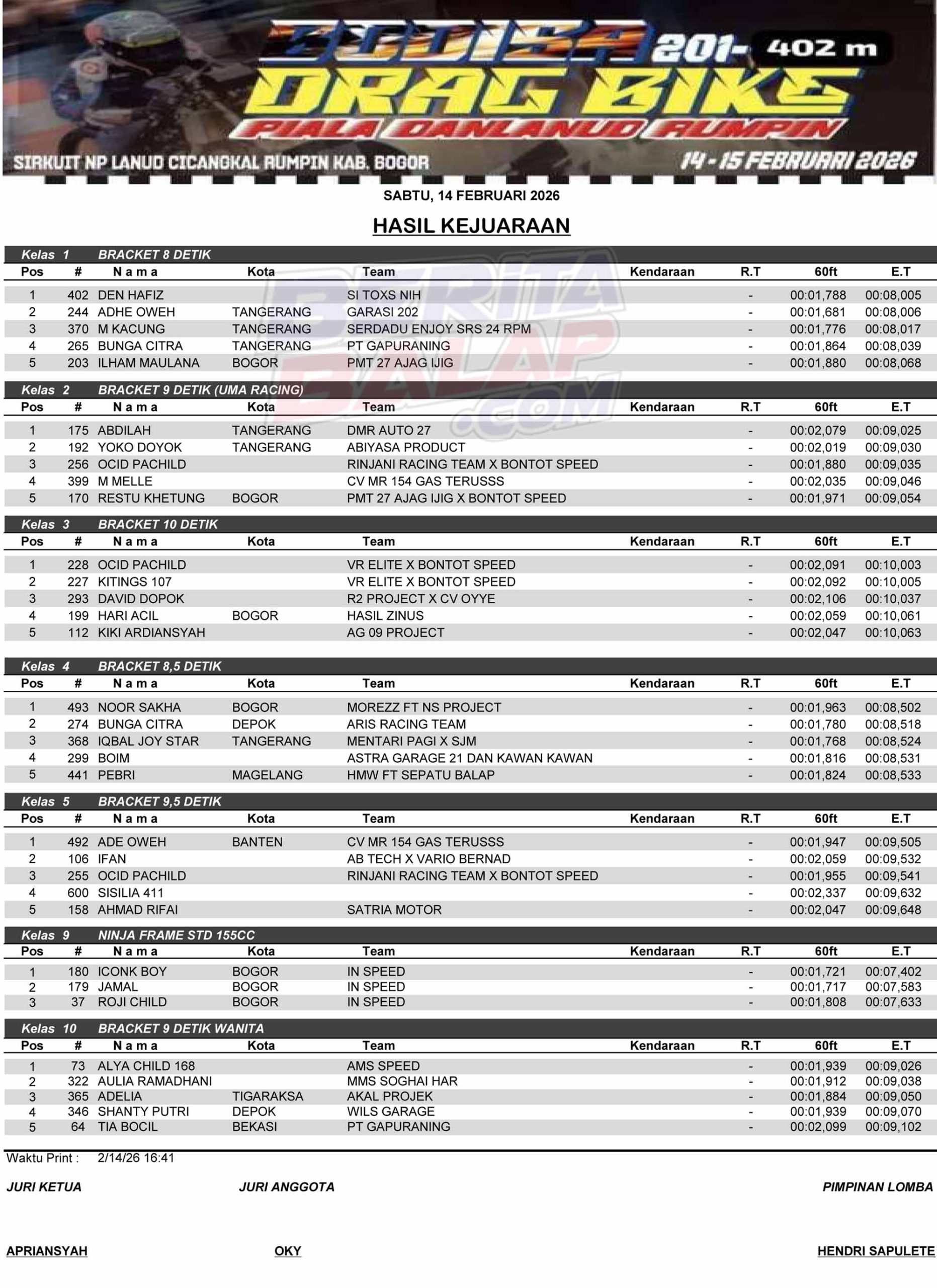 Dragbike Headline 15 Februari, 2026 Hasil Juara Bodisa Drag Bike Piala Danlanud Rumpin 2026 Bogor Posted By: BeritaBalap.com Hasil Bodisa Drag Bike 2026, Hasil Bodisa Drag Bike Piala Danlanud Rumpin 2026 Bogor, Hasil Juara Bodisa Drag Bike Piala Danlanud Rumpin 2026 Bogor BeritaBalap.com- Berikut ini adalah hasil juara Bodisa Drag Bike Piala Danlanud Rumpin 2026 yang berlangsung disirkuit NP Lanud Cicangkal, Rumpin, Bogor pada Sabtu 14 Februari. Edhot