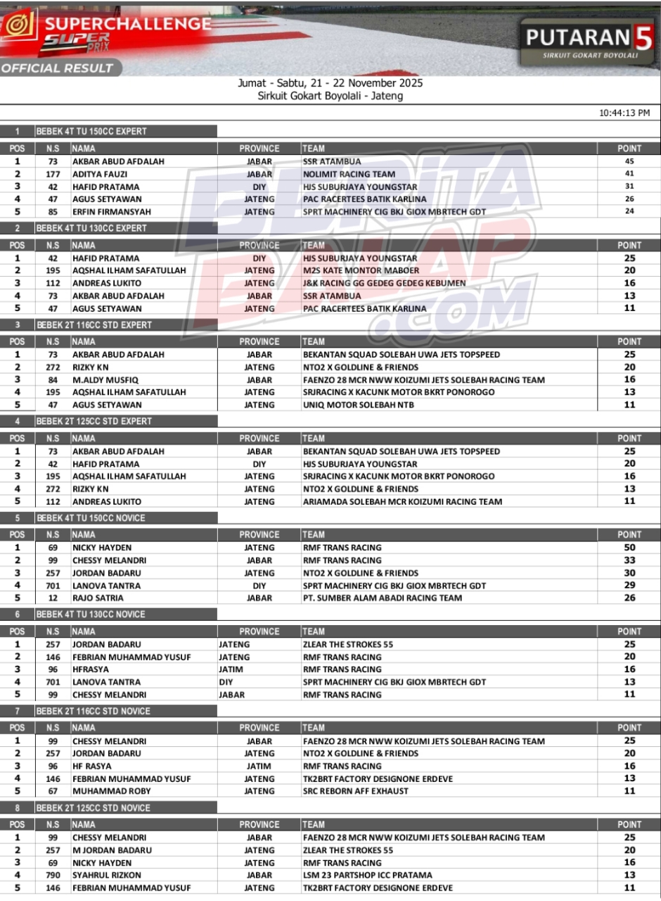 Headline Road Race 22 November, 202522 November, 2025 Hasil Juara Final Superchallenge SuperPrix 2025 Boyolali Posted By: BeritaBalap.com Hasil Final Superchallenge SuperPrix 2025, Hasil Final Superchallenge SuperPrix 2025 Boyolali, Hasil Final SuperPrix 2025, Hasil Juara Final Superchallenge SuperPrix 2025 Boyolali, Hasil Superprix 2025 BeritaBalap.com- Berikut ini adalah hasil juara final Superchallenge SuperPrix 2025 yang berlangsung dilintasan Gokart, Boyolali persembahan Genta Auto & Sport (21-22/11). Edhot