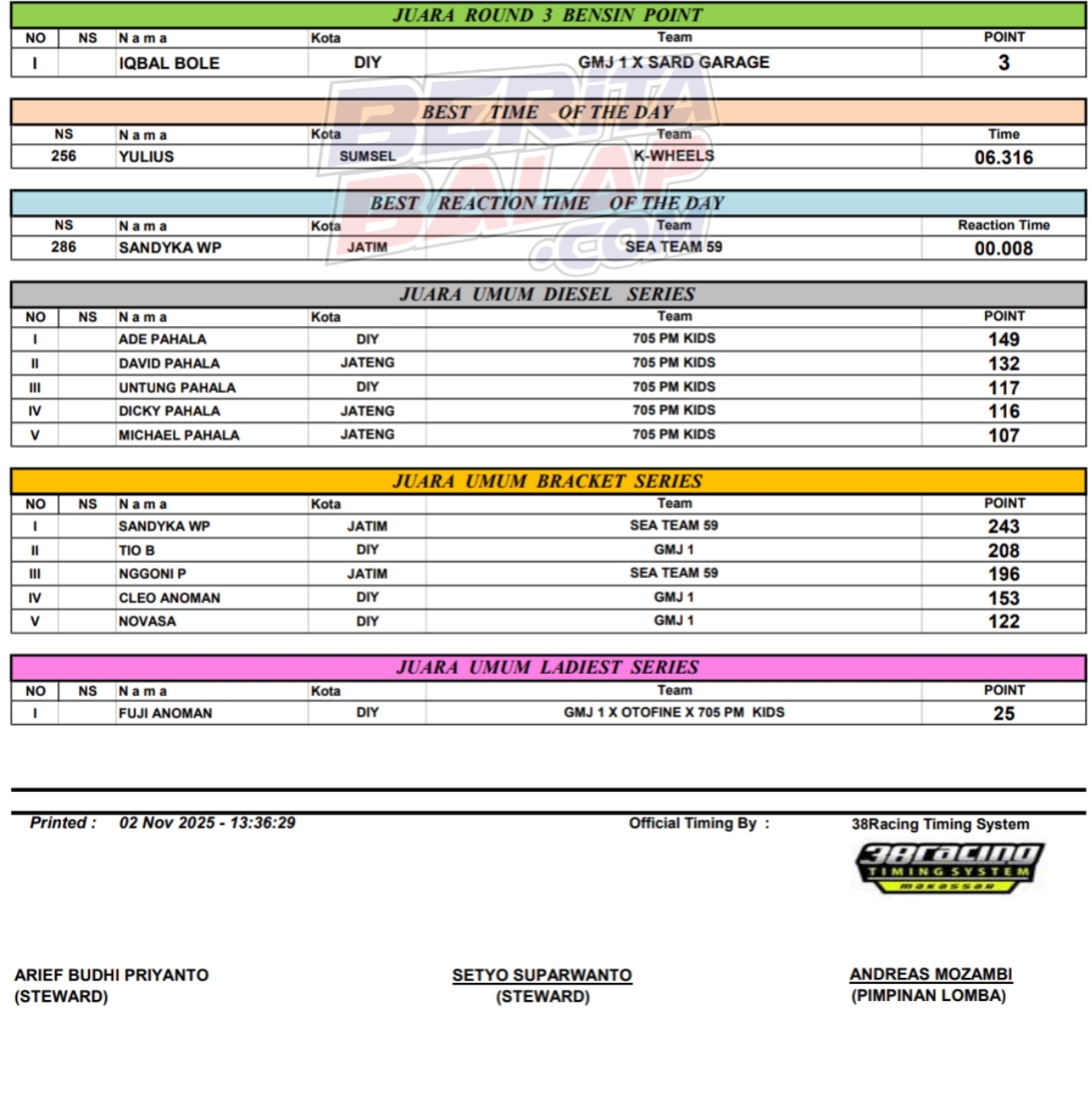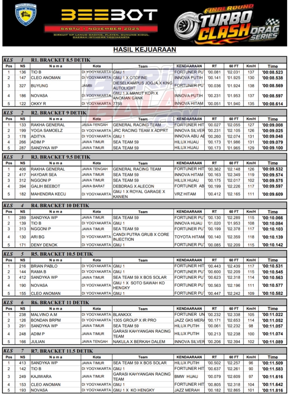 Balap Mobil Headline 2 November, 2025 Hasil Juara Final Turbo Clash Drag Series 2025 Wonosari Posted By: BeritaBalap.com Hasil Final Turbo Clash Drag Series 2025, Hasil Juara Final Turbo Clash Drag Series 2025 Wonosari, Hasil Turbo Clash Drag Series 2025, Turbo Clash Drag Series 2025 BeritaBalap.com- Berikut ini adalah hasil juara final Turbo Clash Drag Series 2025 yang berlangsung di lintasan NP Lanud Gading, Wonosari, Yogyakarta pada Minggu, 2 November. Edhot Facebook Comments