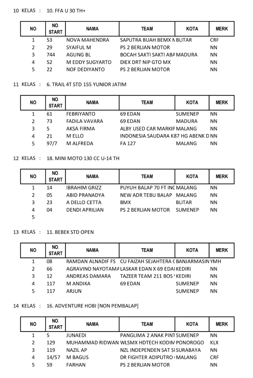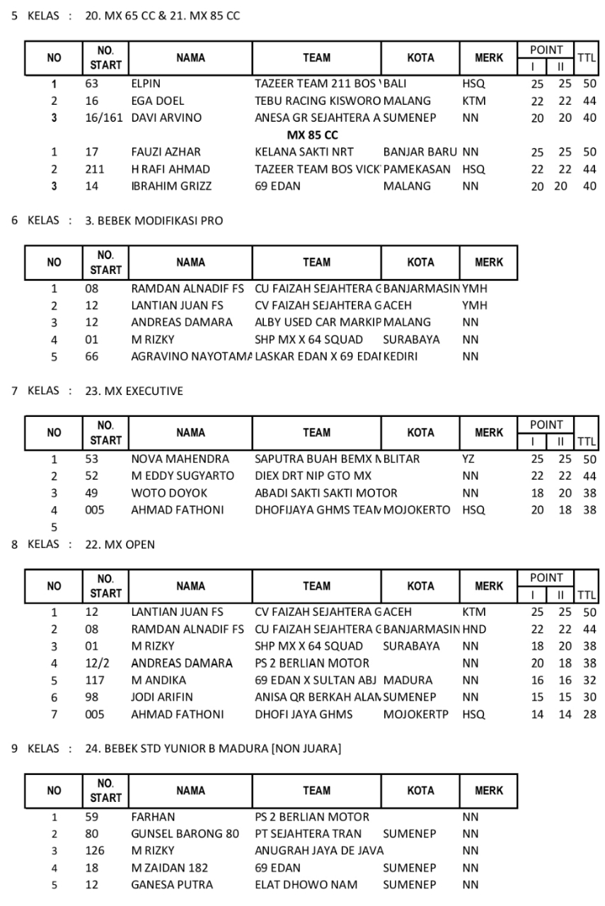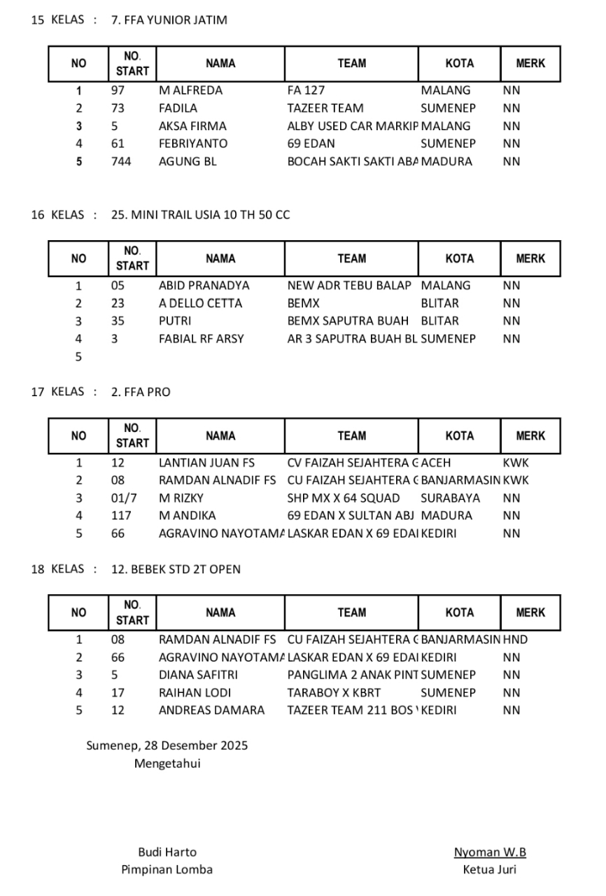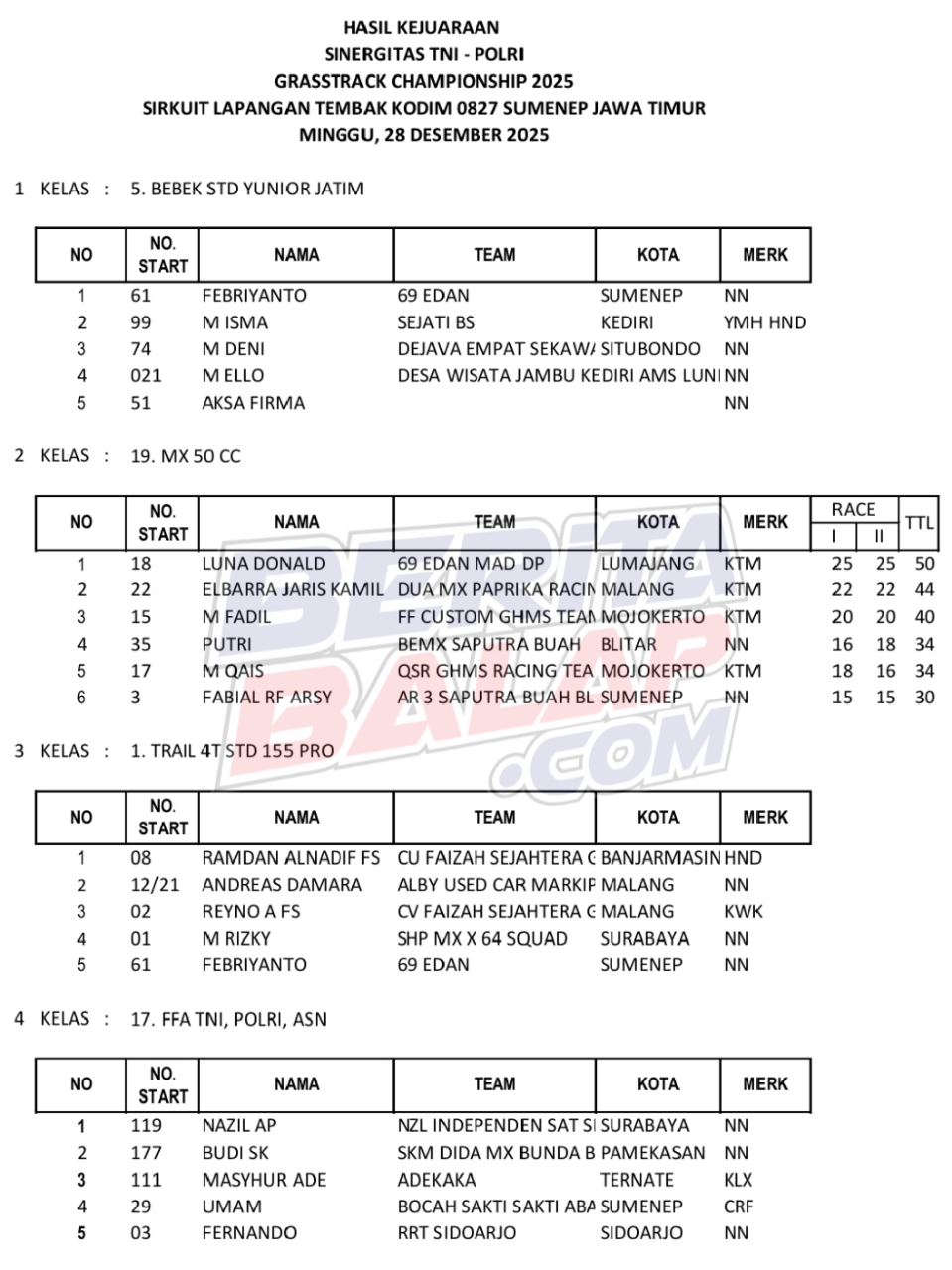 BeritaBalap.com- Berikut ini adalah hasil juara Sinergitas TNI – POLRI Grass track Championship 2025 yang berlangsung di sirkuit Lapangan Tembak Kodim 0827 Sumenep, Jatim pada Minggu, 28 Desember. Cdr