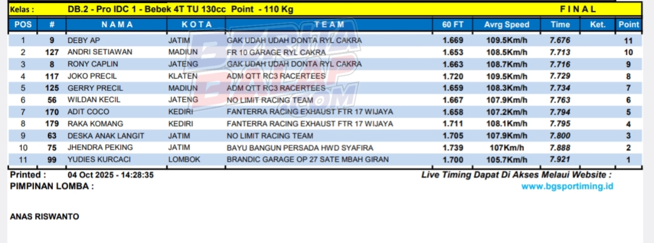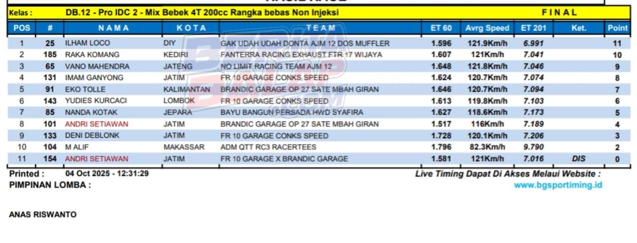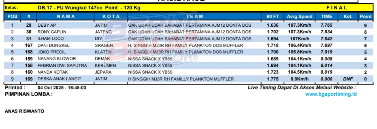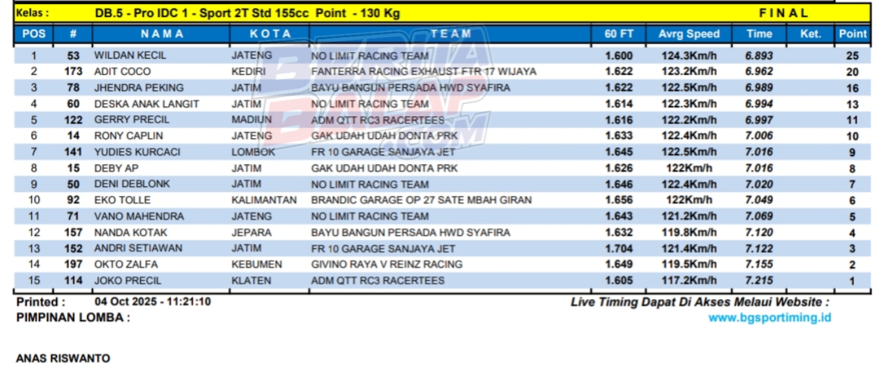 Dragbike Headline 4 Oktober, 20254 Oktober, 2025 Hasil Juara IDC 2025 Round 4 Wonosari Posted By: BeritaBalap.com Hasil IDC 2025, Hasil IDC 2025 Round 4 Wonosari, Hasil IDC 2025 Wonosari, Hasil Juara IDC 2025 Round 4 Wonosari BeritaBalap.com- Berikut ini adalah hasil juara Indo Dragbike Championship (IDC) 2025 round 4 yang berlangsung dilintasan NP Lanud Gading, Wonosari, Yogyakarta pada Sabtu, 4 Oktober. Edhot Facebook Comments