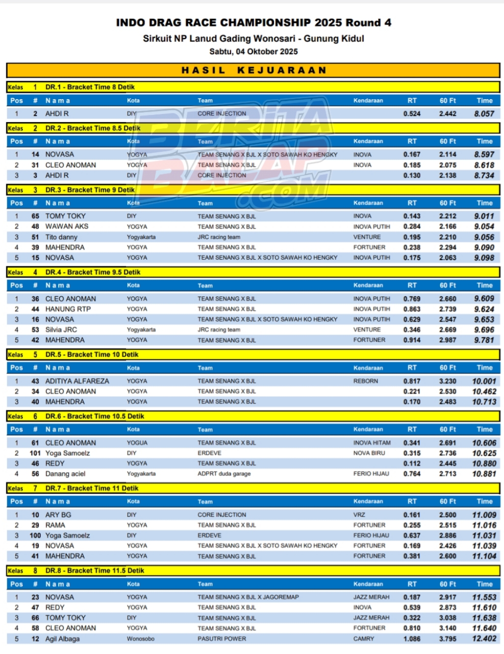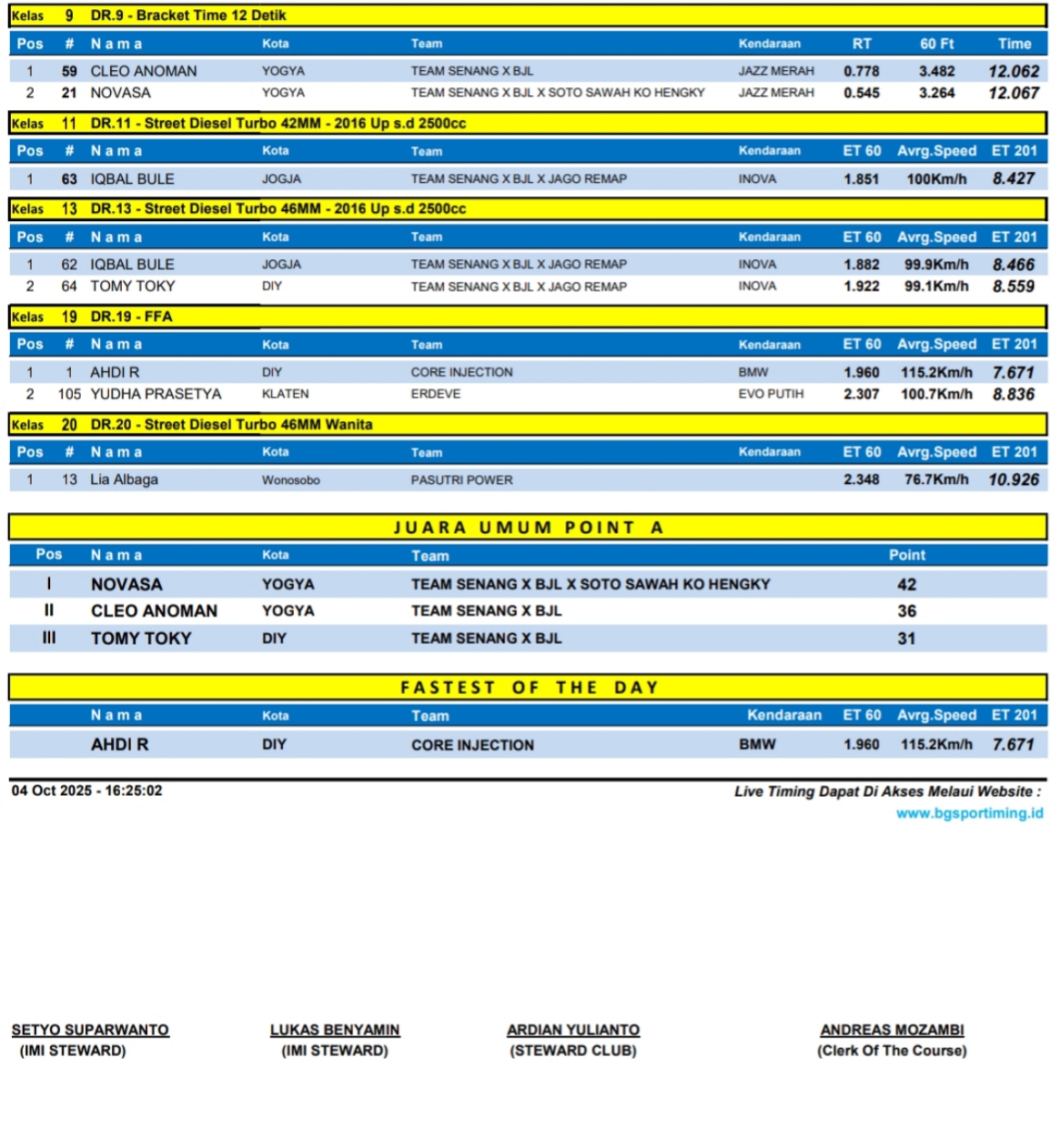 Balap Mobil Headline 4 Oktober, 2025 Hasil Juara Indo Drag Race Championship 2025 Round 4 Wonosari Posted By: BeritaBalap.com Hasil Indo Drag Race Championship 2025, Hasil Indo Drag Race Championship 2025 Round 4 Wonosari, Hasil Juara Indo Drag Race Championship 2025 Round 4 Wonosari BeritaBalap.com- Berikut ini adalah hasil juara Indo Drag Race Championship 2025 round 4 yang berlangsung dilintasan NP Lanud Gading, Wonosari, Yogyakarta pada Sabtu, 4 Oktober. Edhot Facebook Comments
