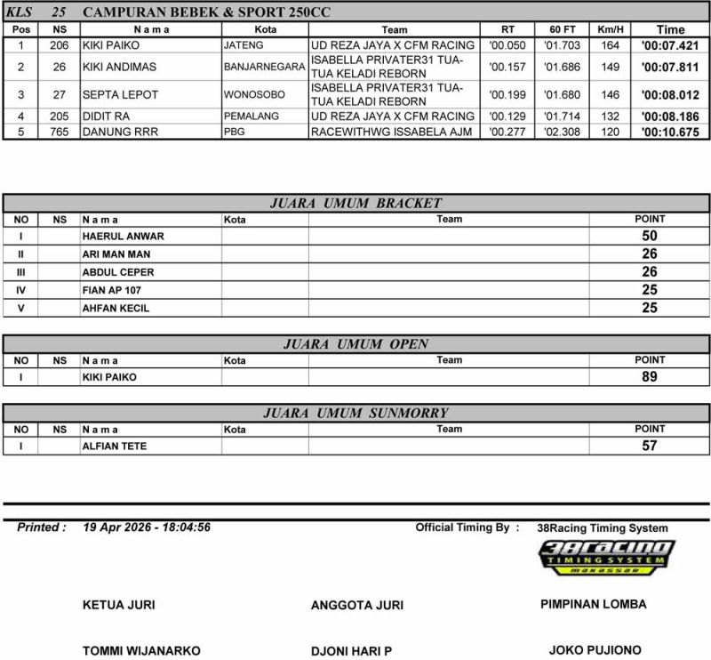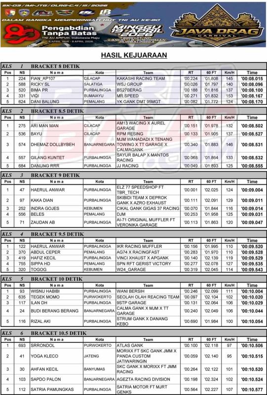 Dragbike Headline 20 April, 2026 Hasil Juara Java Drag Carnival 2026 Purbalingga Posted By: BeritaBalap.com Hasil Java Drag Carnival 2026, Hasil Java Drag Carnival 2026 Purbalingga, Hasil Juara Java Drag Carnival 2026 Purbalingga, Java Drag Carnival 2026 BeritaBalap.com- Berikut ini adalah hasil juara Java Drag Carnival 2026 yang berlangsung di sirkuit NP Lanud JB Soedirman, Purbalingga pada Minggu, 19 April. Edhot