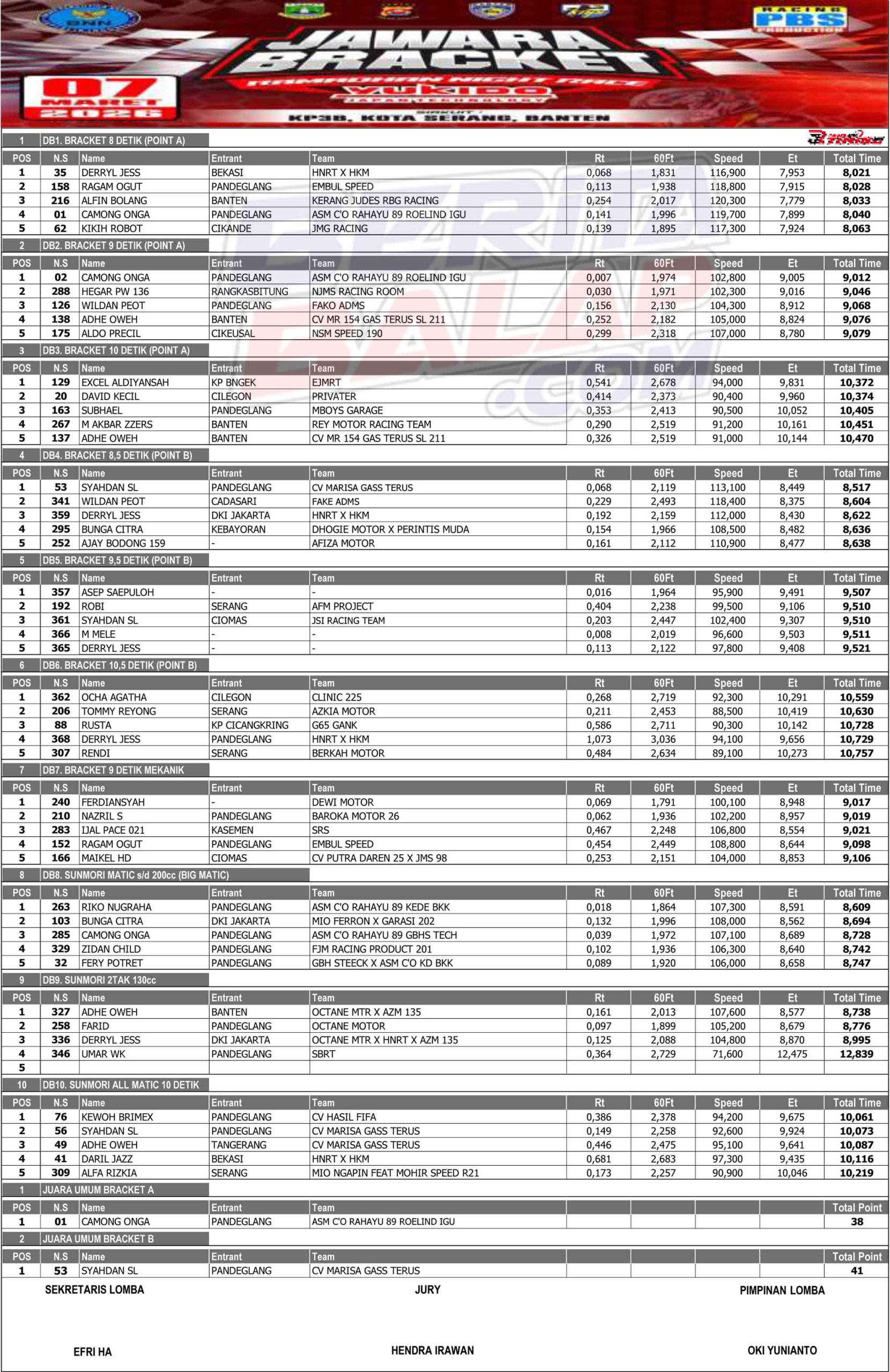 BeritaBalap.com- Berikut ini adalah hasil juara Jawara Bracket Ramadhan Night Race 2026 yang berlangsung dilintasan non permanen KP3B, Serang, Banten pada Sabtu, 7 Maret. Edhot