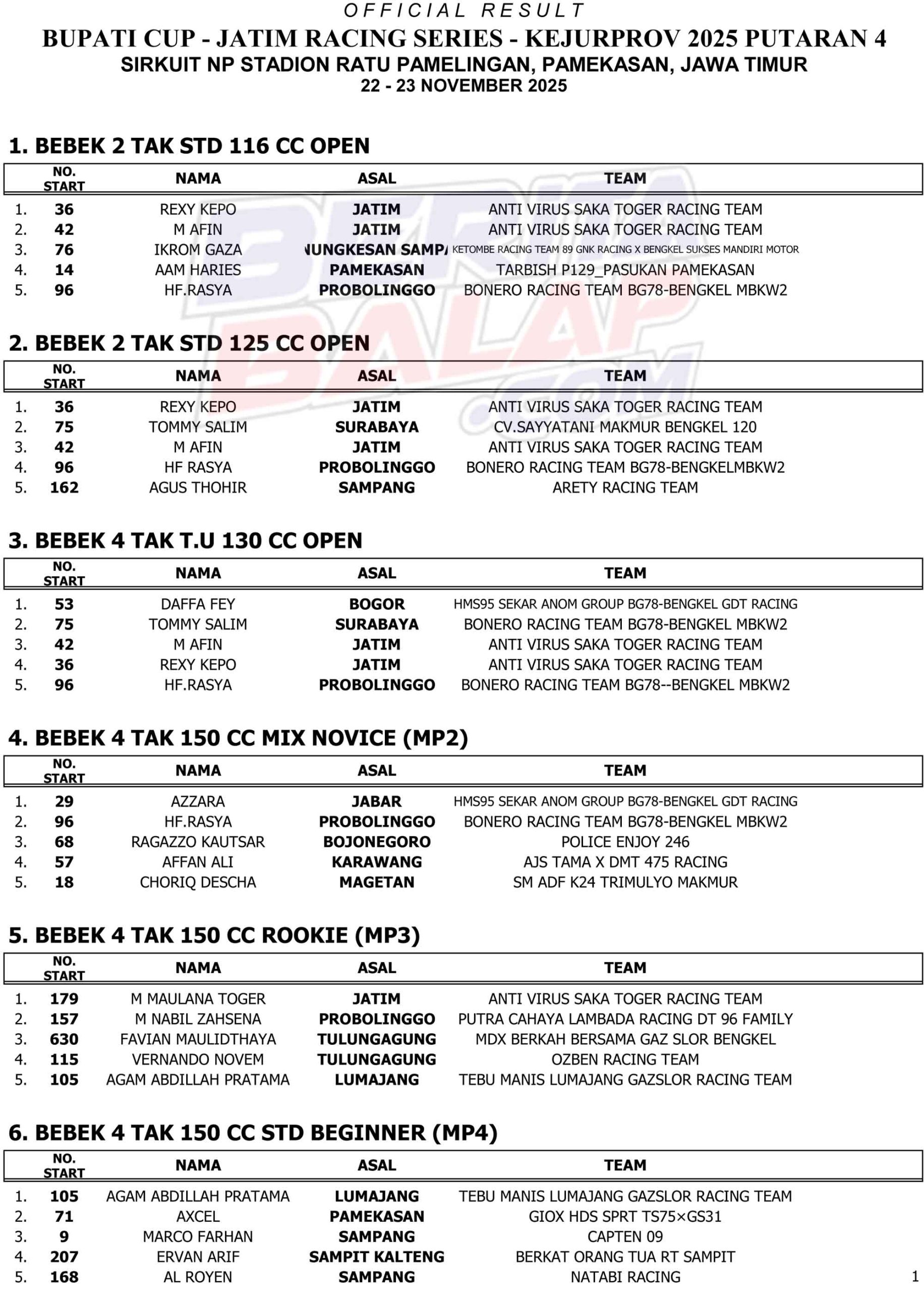 Headline Road Race 24 November, 2025 Hasil Juara Kejuprov Jatim 2025 Pamekasan Posted By: BeritaBalap.com Hasil Juara Kejuprov Jatim 2025, Hasil Juara Kejuprov Jatim 2025 Pamekasan BeritaBalap.com- Berikut ini adalah hasil juara Kejurprov Jatim racing Series 2025 putaran 4 yang berlangsung dilintasan NP Stadion Ratu Pamelingan, Pamekasan, Jawa Timur, pada 22-23 November. CDR Facebook Comments