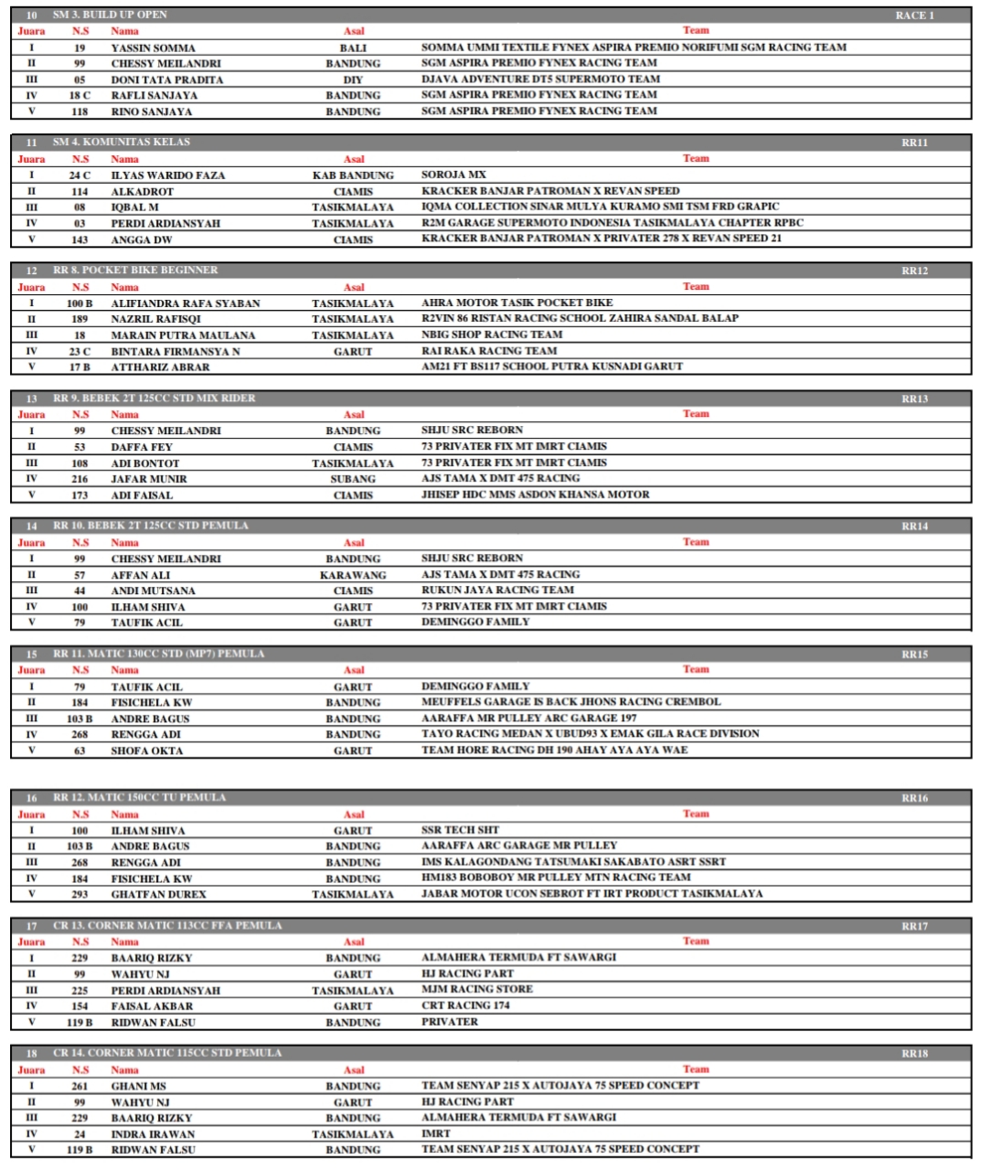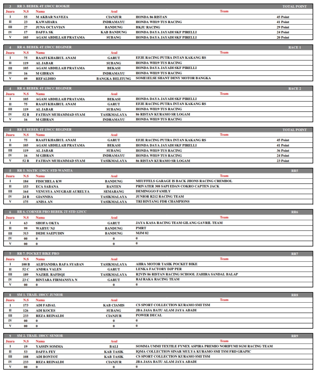 Headline Road Race 9 November, 20259 November, 2025 Hasil Juara Kejurda Road Race & Supermoto Jabar 2025 Tasikmalaya Posted By: BeritaBalap.com Hasil Juara Kejurda Road Race & Supermoto Jabar 2025 Tasikmalaya, Hasil Juara Kejurda Road Race Jabar Jabar 2025, Hasil Juara Kejurda Supermoto Jabar 2025 BeritaBalap.com- Berikut ini adalah hasil juara Kejurda Road Race & Supermoto Jabar 2025 yang berlangsung dilintasan Bukit Peusar, Tasikmalaya (8-9/11). Edhot / Foto : Dok Agi