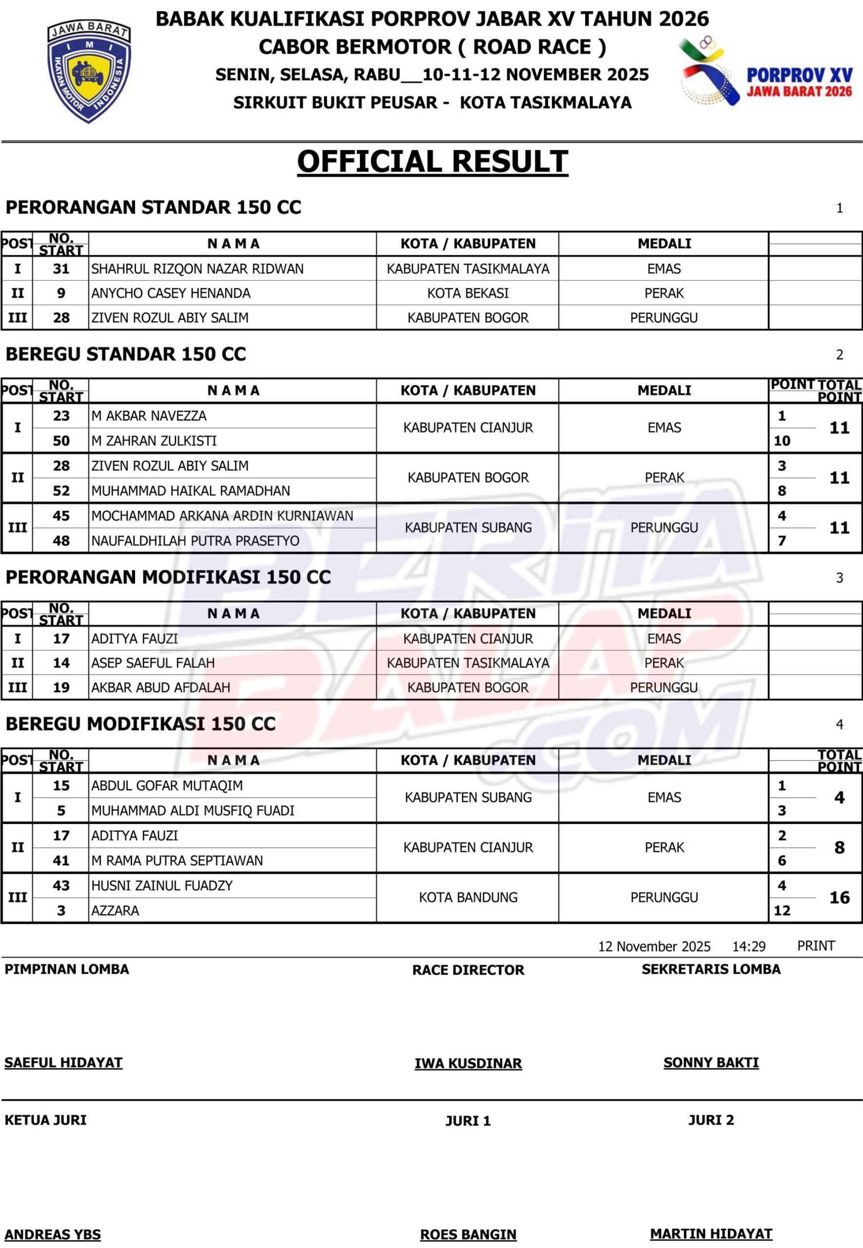 Headline Road Race 12 November, 202512 November, 2025 Hasil Juara Lengkap BK Porprov Jabar XV 2026 Cabor Bermotor Tasikmalaya Posted By: BeritaBalap.com BK Porprov Jabar XV 2026 Cabor Bermotor Tasikmalaya, Hasil BK Porprov Jabar XV 2026 Cabor Bermotor, Hasil BK Porprov Jabar XV 2026 Cabor Bermotor Tasikmalaya, Hasil Juara Lengkap BK Porprov Jabar XV 2026 Cabor Bermotor Tasikmalaya BeritaBalap.com- Berikut ini adalah hasil juara lengkap Babak Kualifikasi (BK) Porprov Jabar XV 2026 Cabor Bermotor yang telah usai dipentaskan diatas lintasan Bukit Peusar, Tasikmalaya pada 10-12 November. Edhot Facebook Comments