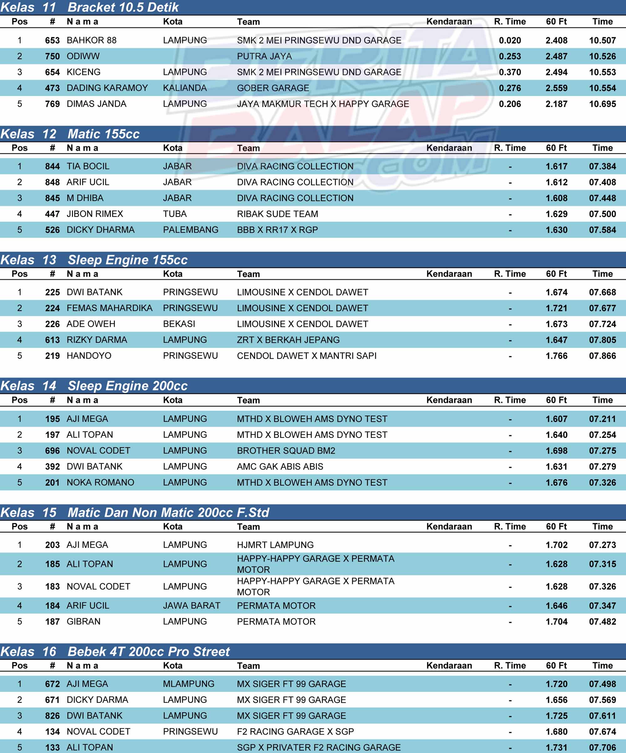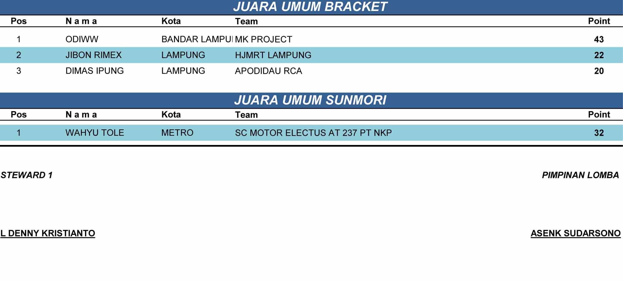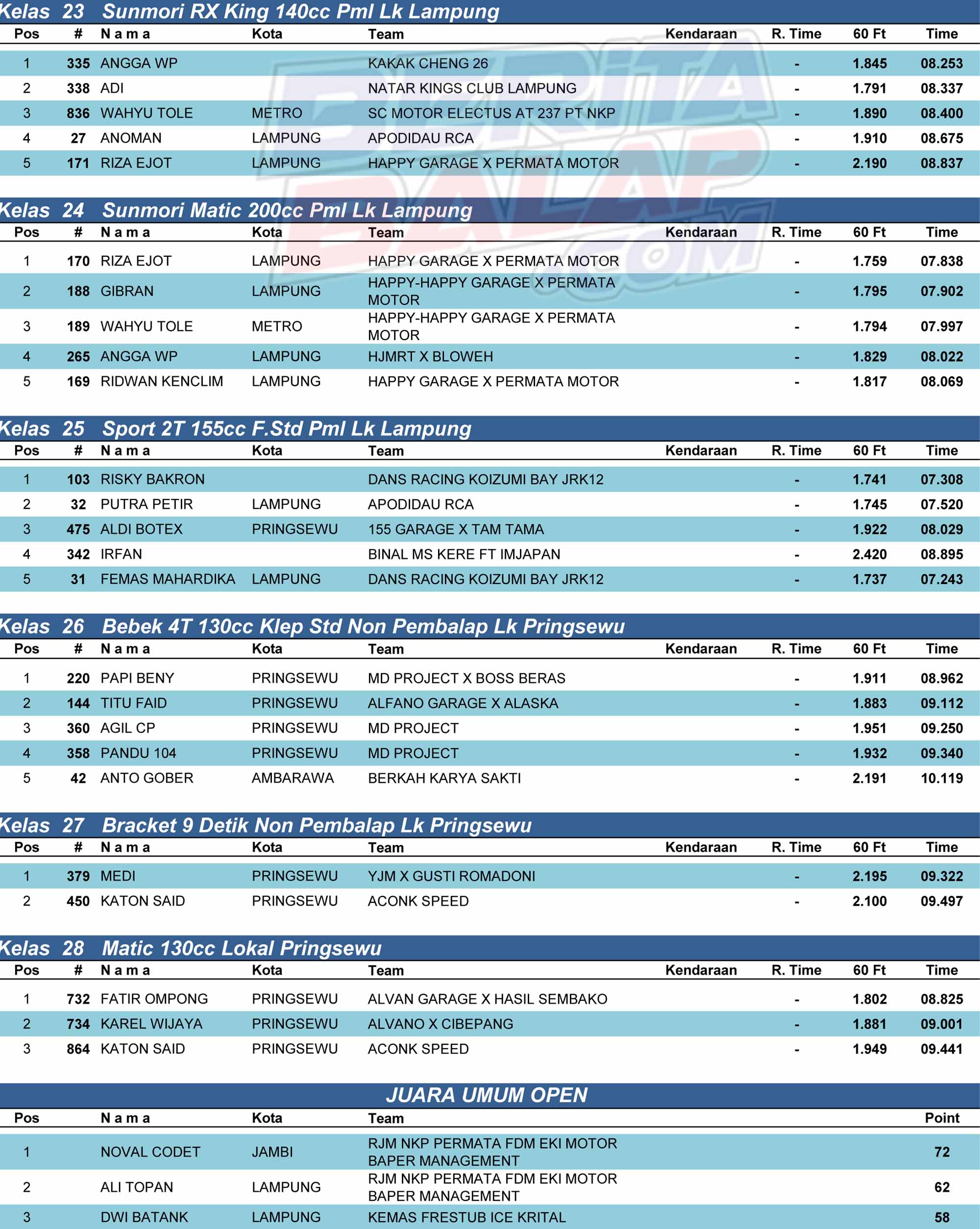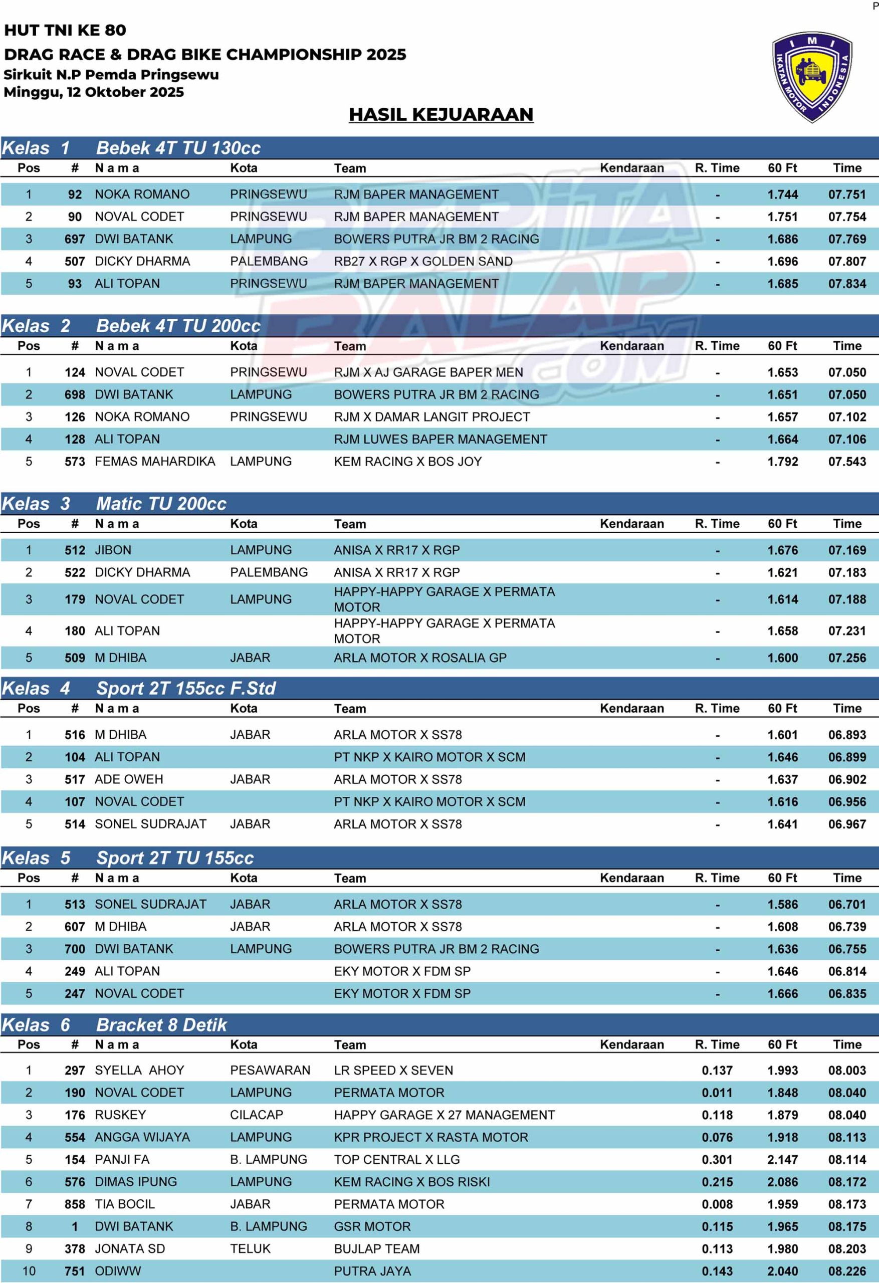 Dragbike Headline 12 Oktober, 2025 Hasil Juara Lengkap Drag Bike Championship 2025 Pringsewu Posted By: BeritaBalap.com Drag Bike Championship 2025 Pringsewu, Hasil Drag Bike Championship 2025 Pringsewu, Hasil Juara Lengkap Drag Bike Championship 2025 Pringsewu BeritaBalap.com- Berikut ini adalah hasil juara lengkap Drag Bike Championship 2025 yang berlangsung di sirkuit NP Pemda Pringsewu, Lampung pada Minggu, 12 Oktober. Edhot Facebook Comments