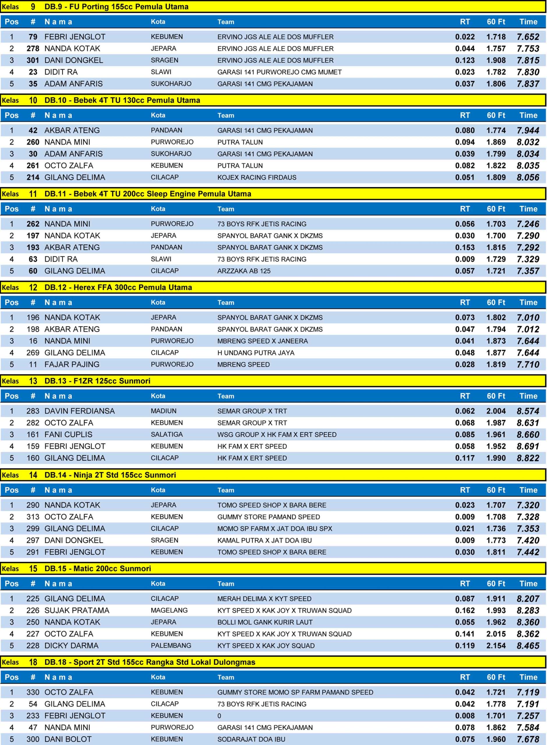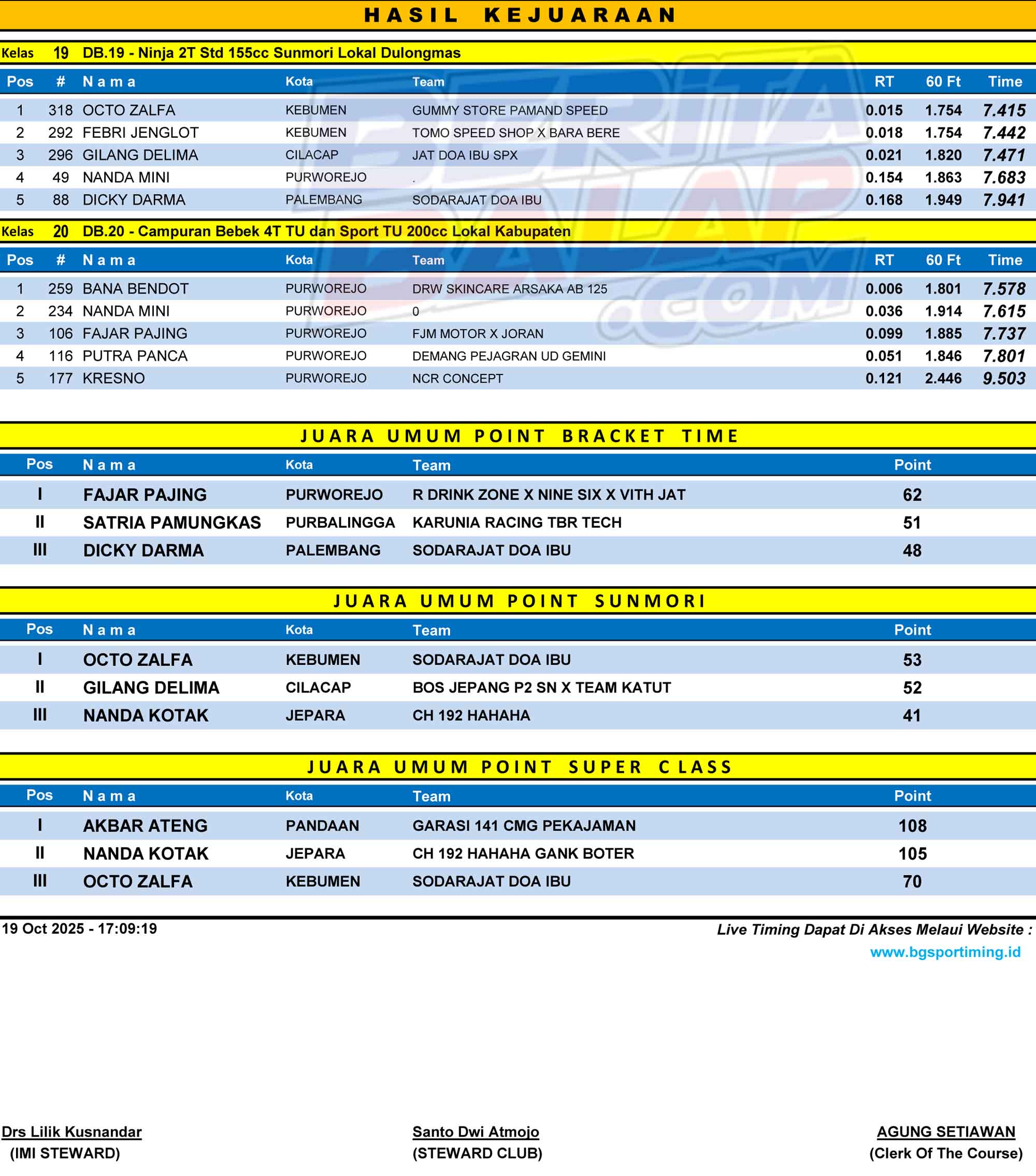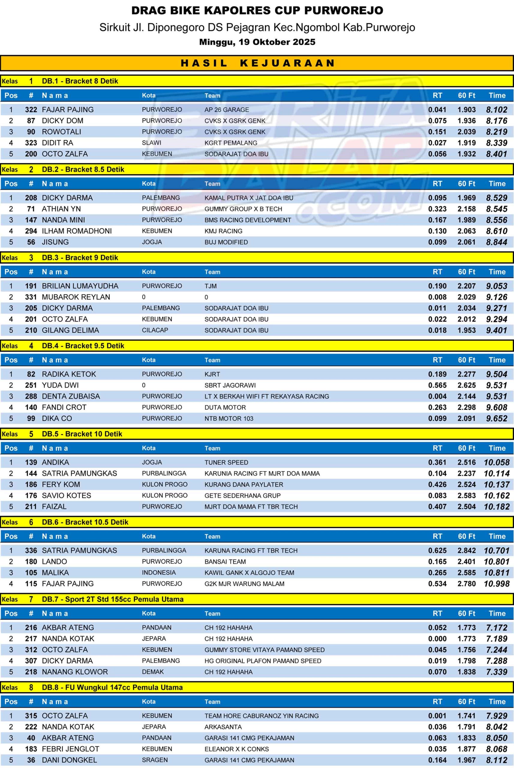BeritaBalap.com- Berikut ini adalah hasil juara lengkap Drag Bike Kapolres Cup Purworejo 2025 yang berlangsung disirkuit non permanen Jl. Diponegoro DS Pejagran Kec. Ngombol, Purworejo pada Minggu, 19 Oktober. Edhot