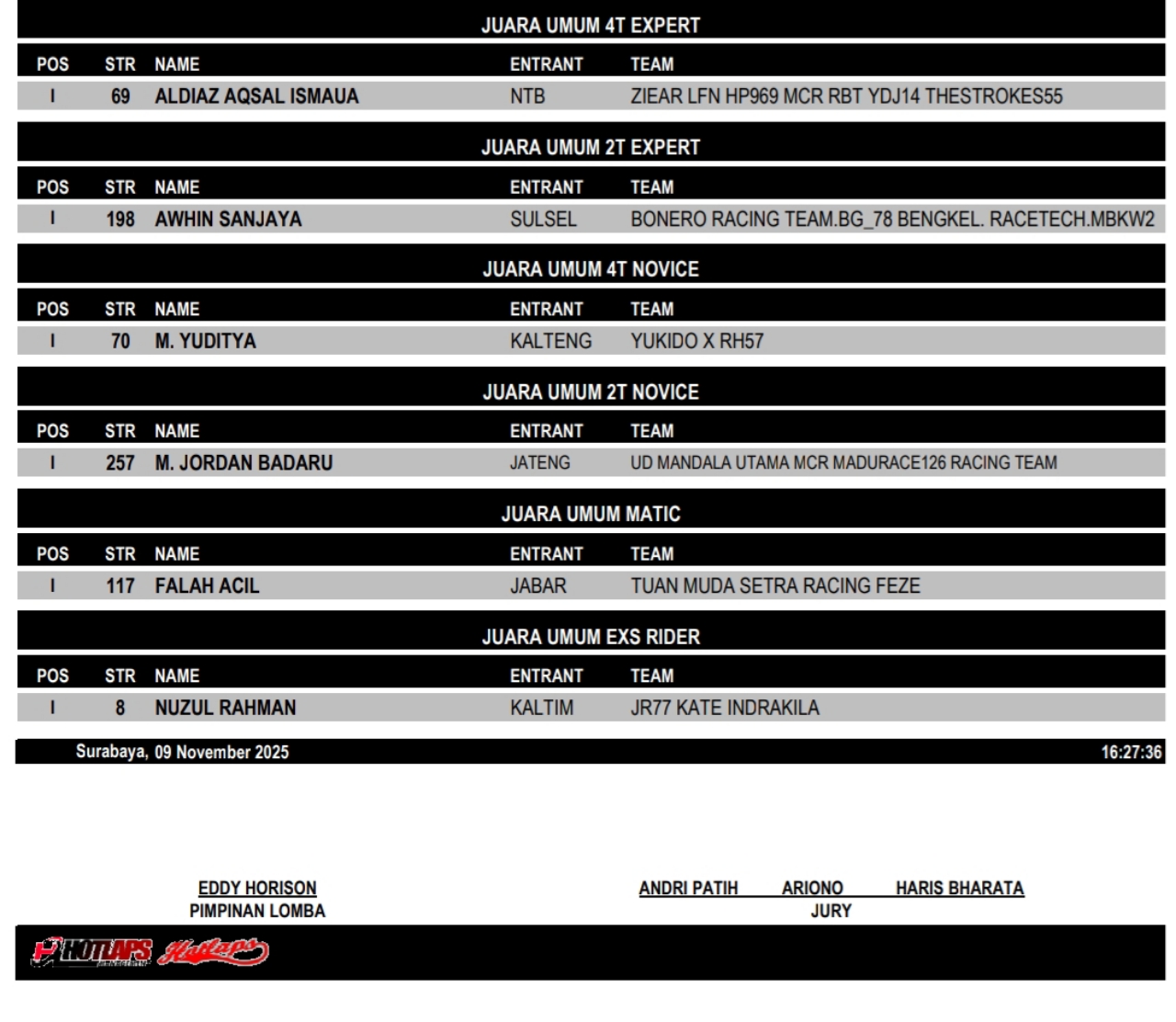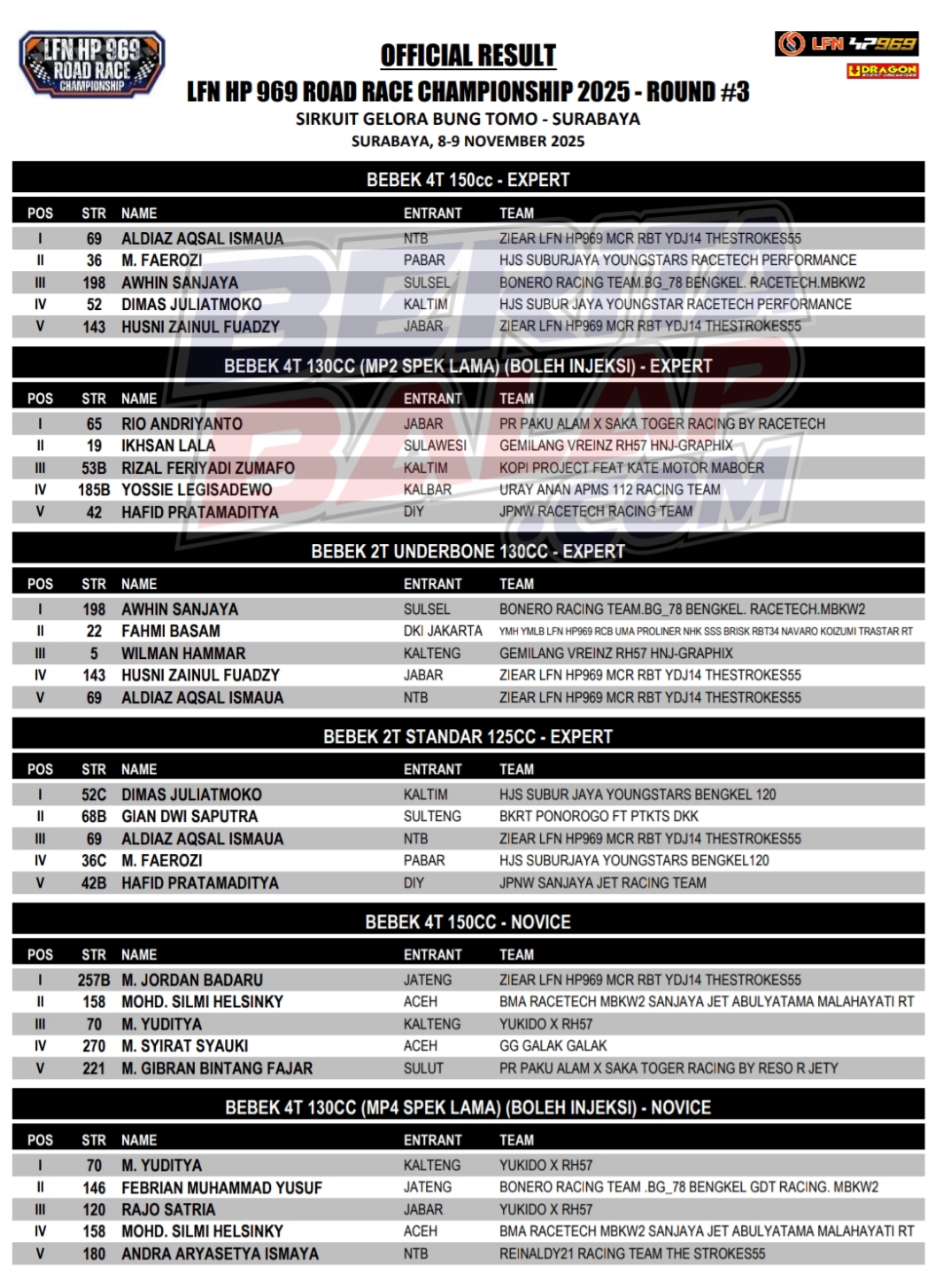 Headline Road Race 9 November, 20259 November, 2025 Hasil Juara Lengkap Final LFN HP969 Road Race Championship 2025 Surabaya Posted By: BeritaBalap.com Hasil Final LFN HP969 Road Race Championship 2025, Hasil Final LFN HP969 Road Race Championship 2025 Surabaya, Hasil Juara Lengkap Final LFN HP969 Road Race Championship 2025 Surabaya BeritaBalap.com- Berikut ini adalah hasil juara lengkap final LFN HP969 Road Race Championship 2025 yang berlangsung dilintasan GBT, Surabaya (8-9/11). Edhot Facebook Comments