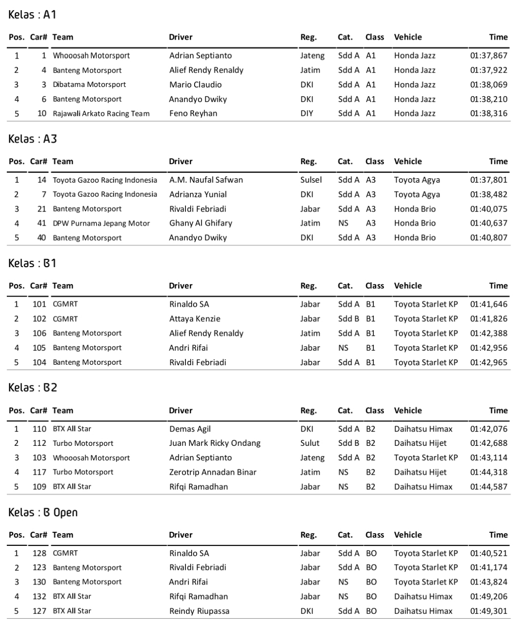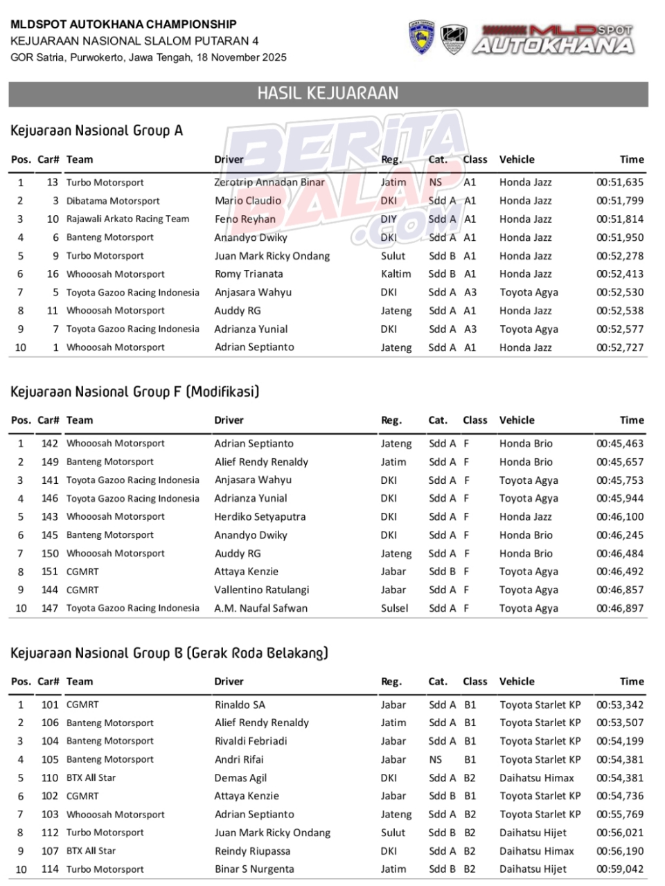 BeritaBalap.com- Berikut ini adalah hasil juara lengkap MLD Spot Auto khana Kejurnas Slalom 2025 yang berlangsung di lintasan NP GOR Satria, Purwokerto pada Sabtu, 18 Oktober. Edhot