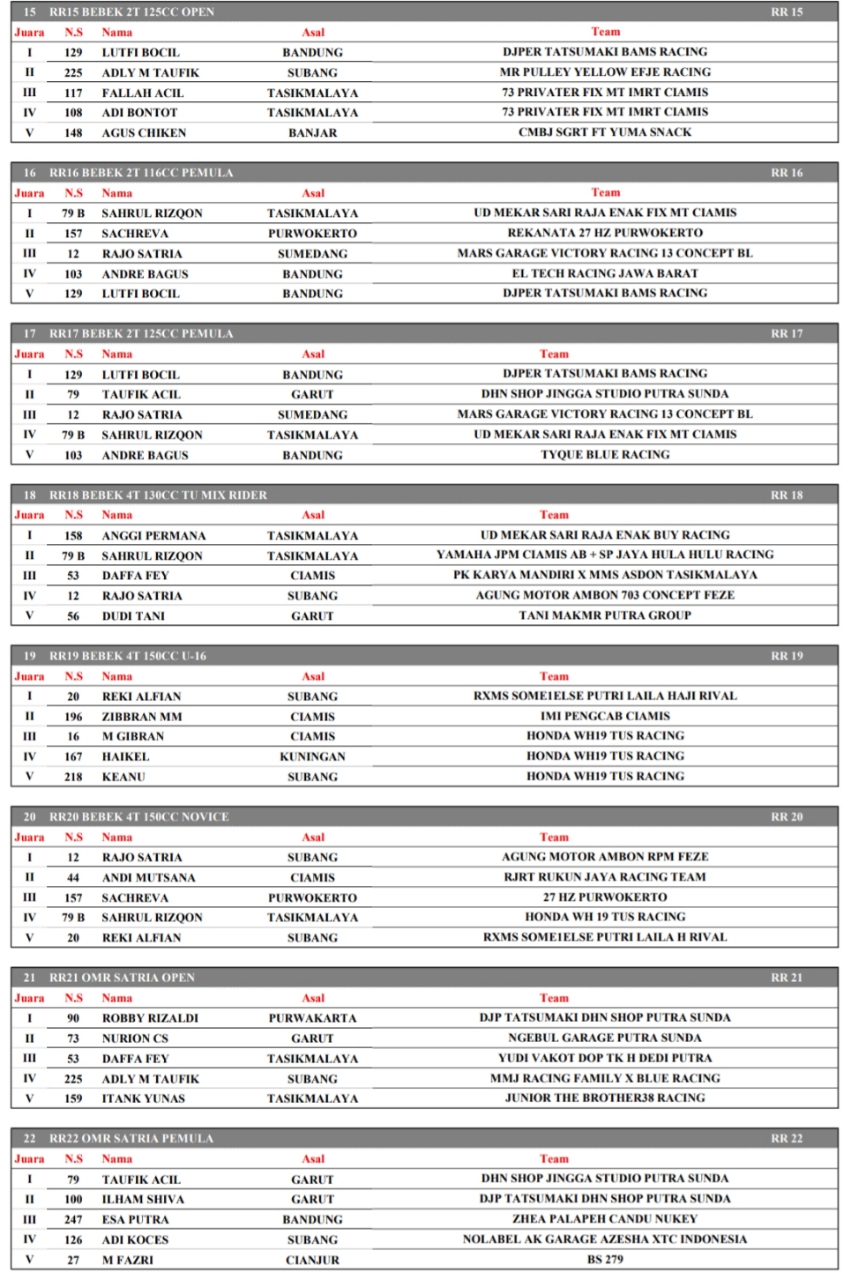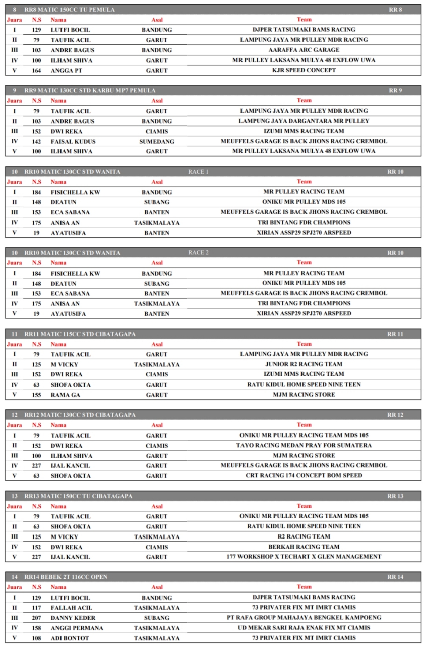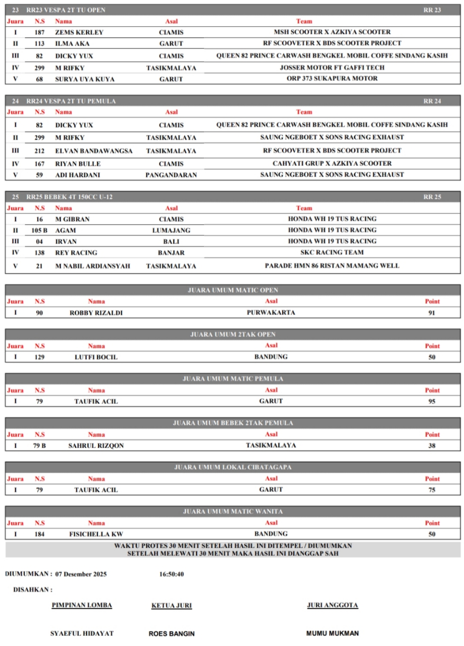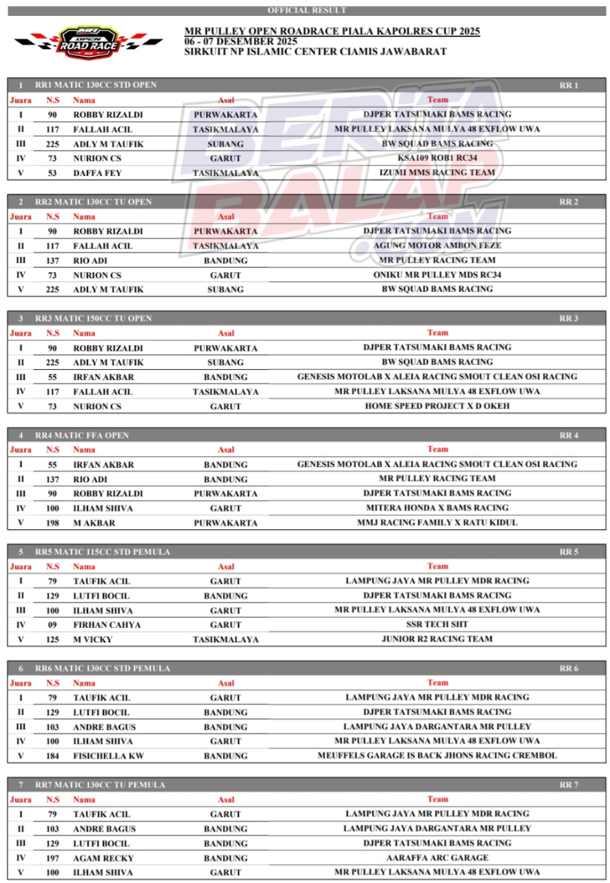 Headline Road Race 7 Desember, 20257 Desember, 2025 Hasil Juara Lengkap MR Pulley Open Road Race 2025 Ciamis Posted By: BeritaBalap.com Hasil Juara Lengkap MR Pulley Open Road Race 2025 Ciamis, Hasil MR Pulley Open Road Race 2025 Ciamis, MR Pulley Open Road Race 2025 Ciamis BeritaBalap.com- Berikut ini adalah hasil juara lengkap MR Pulley Open Road Race 2025 yang berlangsung di lintasan NP Islamic Center, Ciamis (6-7/12). Tim Facebook Comments