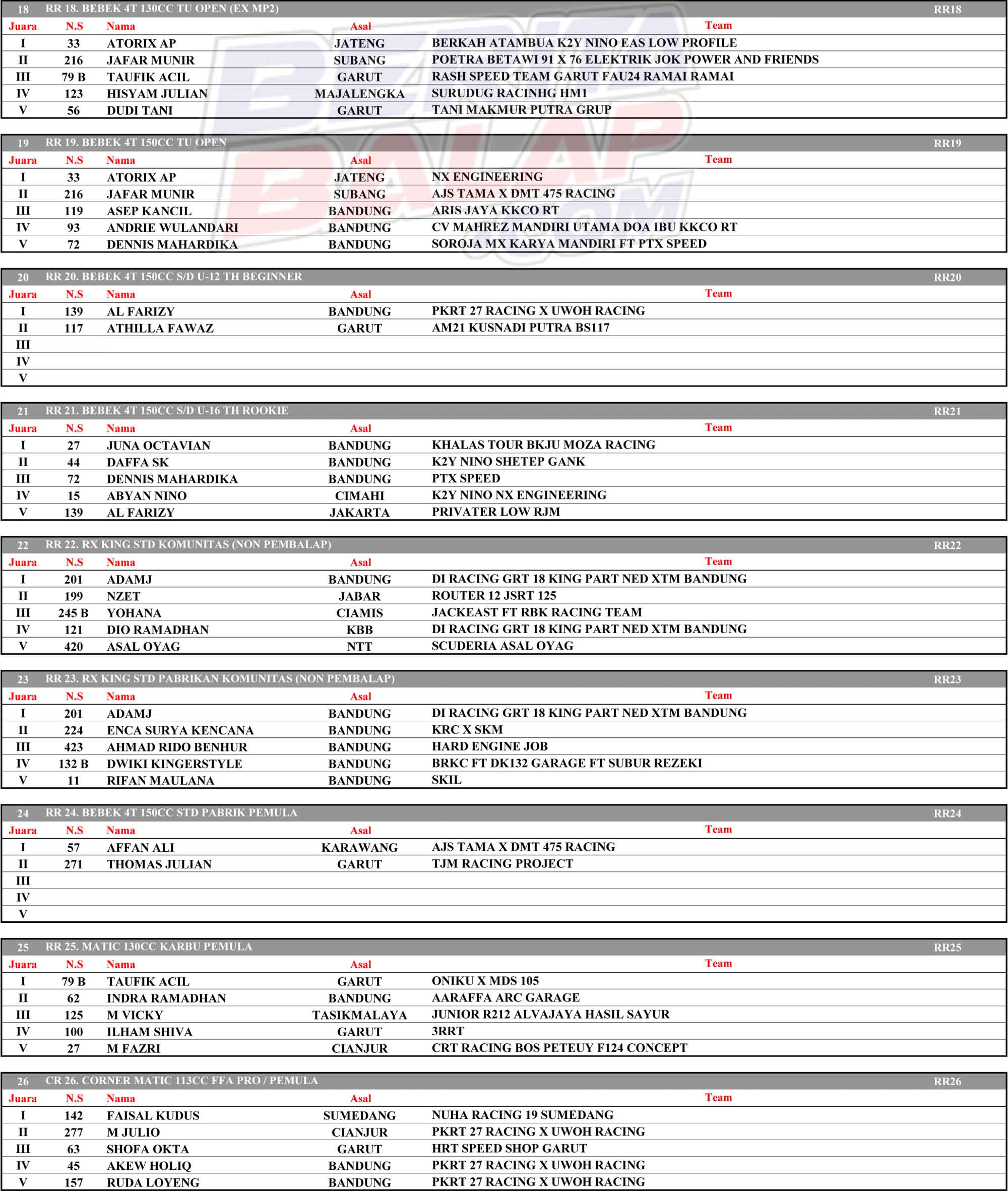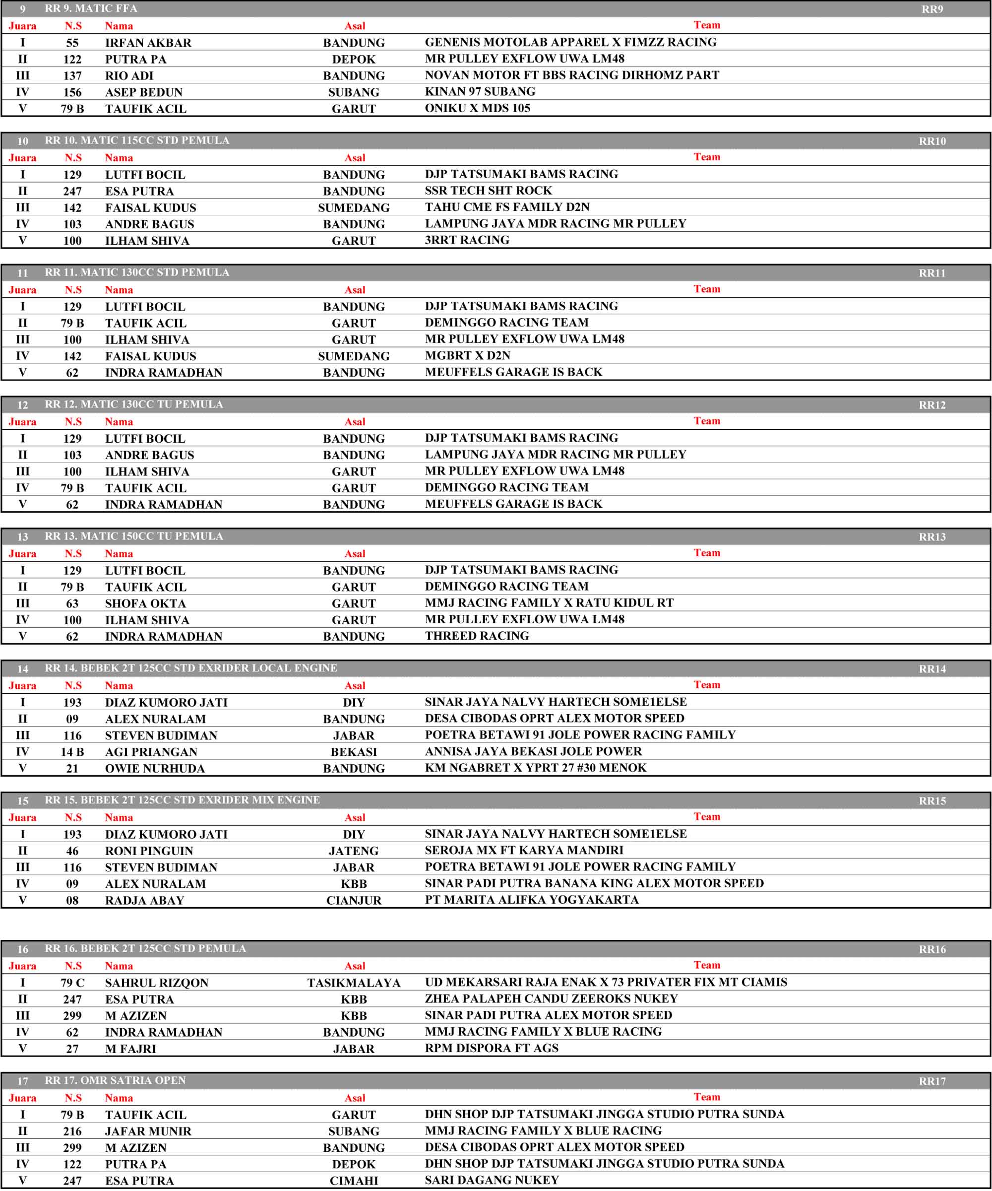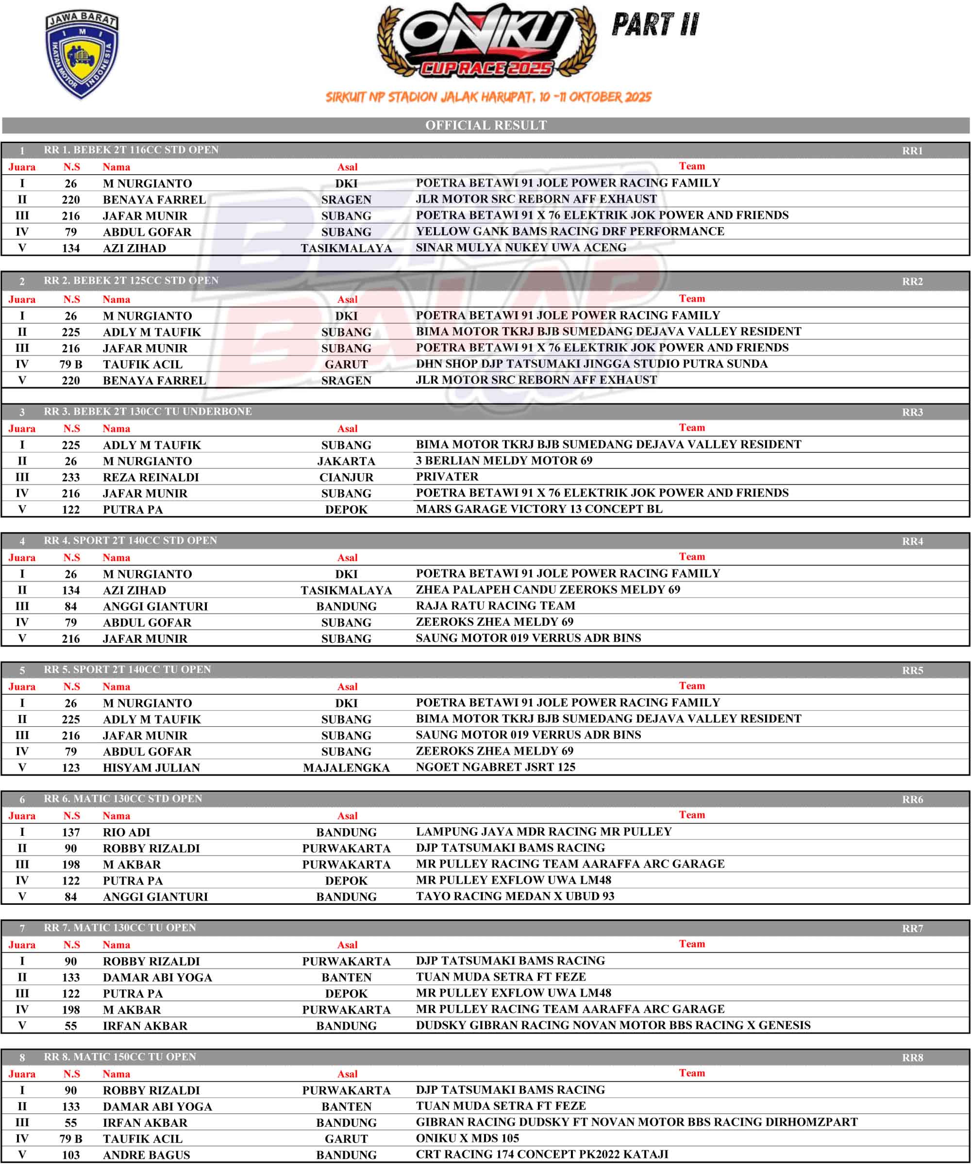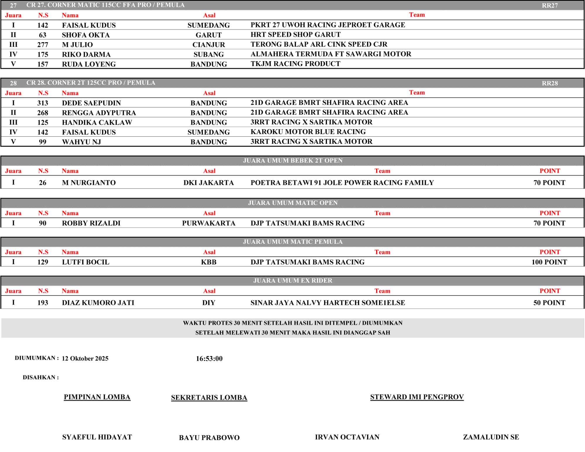 Headline Road Race 12 Oktober, 2025 Hasil Juara Lengkap Road Race 2025 Bandung Posted By: BeritaBalap.com Hasil Juara Lengkap Road Race 2025 Bandung, Hasil Juara Road Race 2025 Bandung, Hasil Road Race 2025 Bandung BeritaBalap.com- Berikut ini adalah hasil juara lengkap Road Race 2025 yang berlangsung dilintasan NP Stadion Si Jalak Harupat, Soreang Kabupaten Bandung (10-11/10). Edhot Facebook Comments