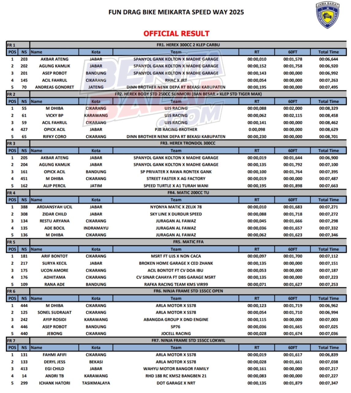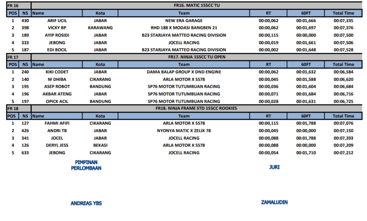 Dragbike Headline 5 Oktober, 20255 Oktober, 2025 Hasil Juara Meikarta Speedway Funrace Drag Bike 2025 Posted By: BeritaBalap.com Hasil Funrace Drag Bike Meikarta, Hasil Juara Meikarta Speedway Funrace Drag Bike 2025 , Hasil Meikarta Speedway Funrace Drag Bike 2025 BeritaBalap.com- Berikut ini adalah hasil juara Meikarta Speedway Funrace Drag Bike 2025 yang berlangsung dilintasan Meikarta Speedway, Cikarang (4/10). Edhot Facebook Comments