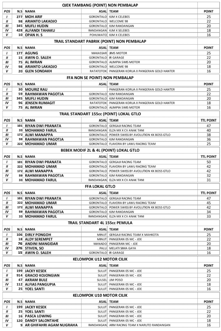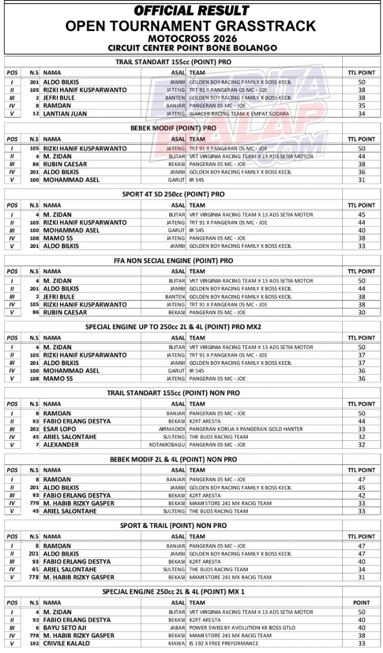 BeritaBalap.com- Berikut ini adalah hasil juara Open Tournament Grasstrack & Motocross 2026 yang berlangsung di sirrkuit Center Point Bone Bolango, Gorontalo (25/1). BB1