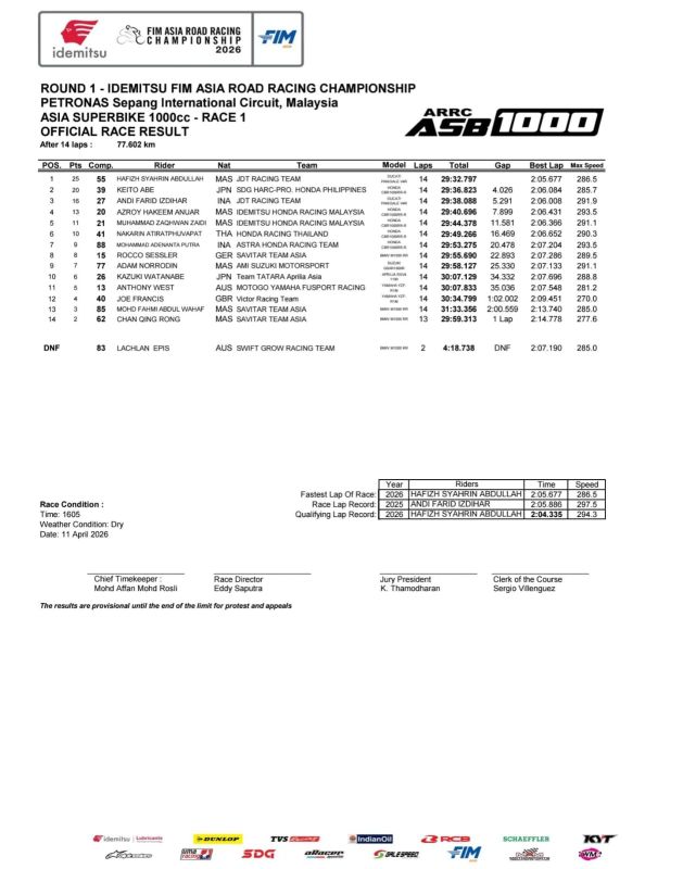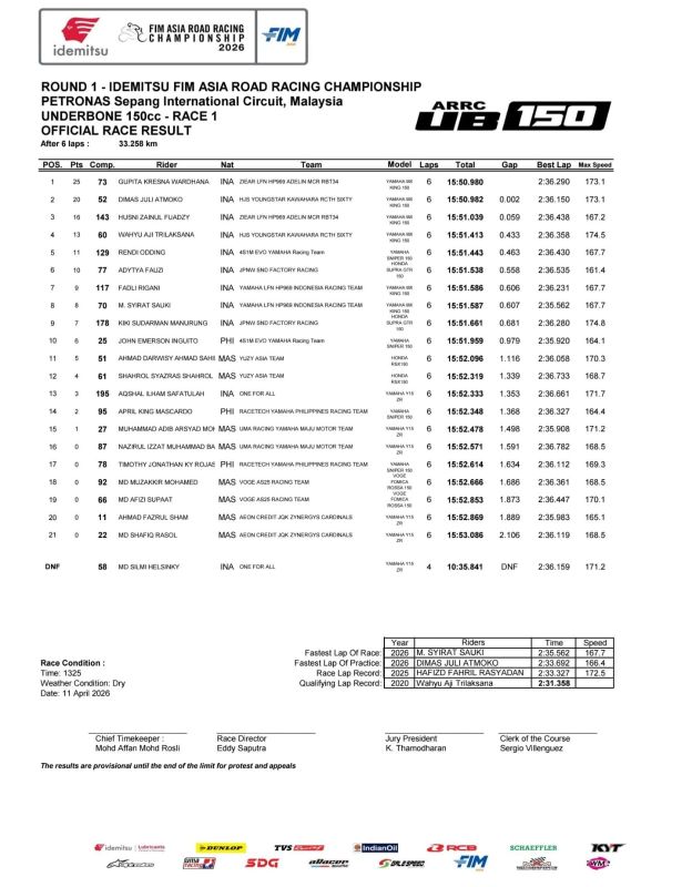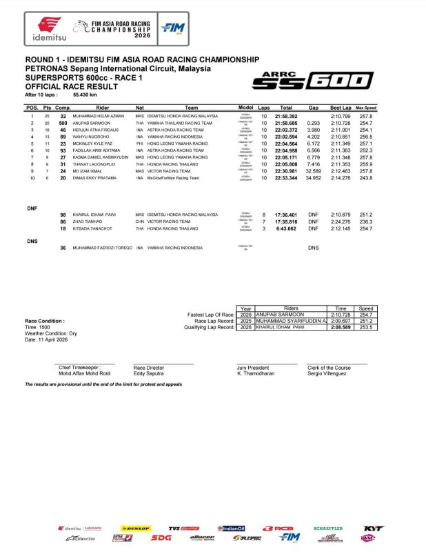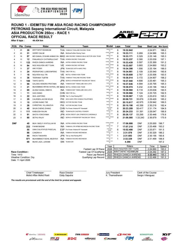 ARRC Headline Road Race 11 April, 2026 Hasil Juara Race 1 ARRC 2026 Malaysia Posted By: BeritaBalap.com Hasil ARRC 2026 Malaysia, Hasil Juara Race 1 ARRC 2026 Malaysia BeritaBalap.com- Berikut ini adalah juara race 1 Asia Road Racing (ARRC) round 1 yang berlangsung dilintasan Sepang, Malaysia (12/4). BB1