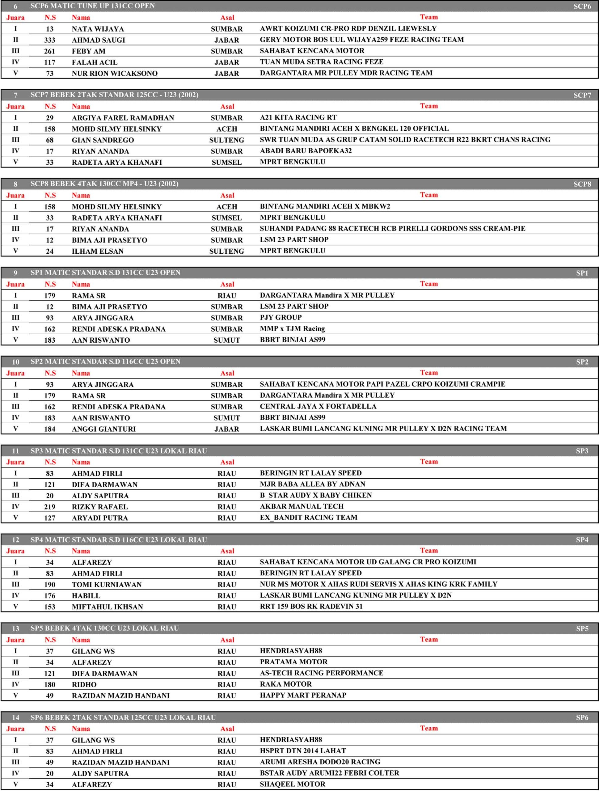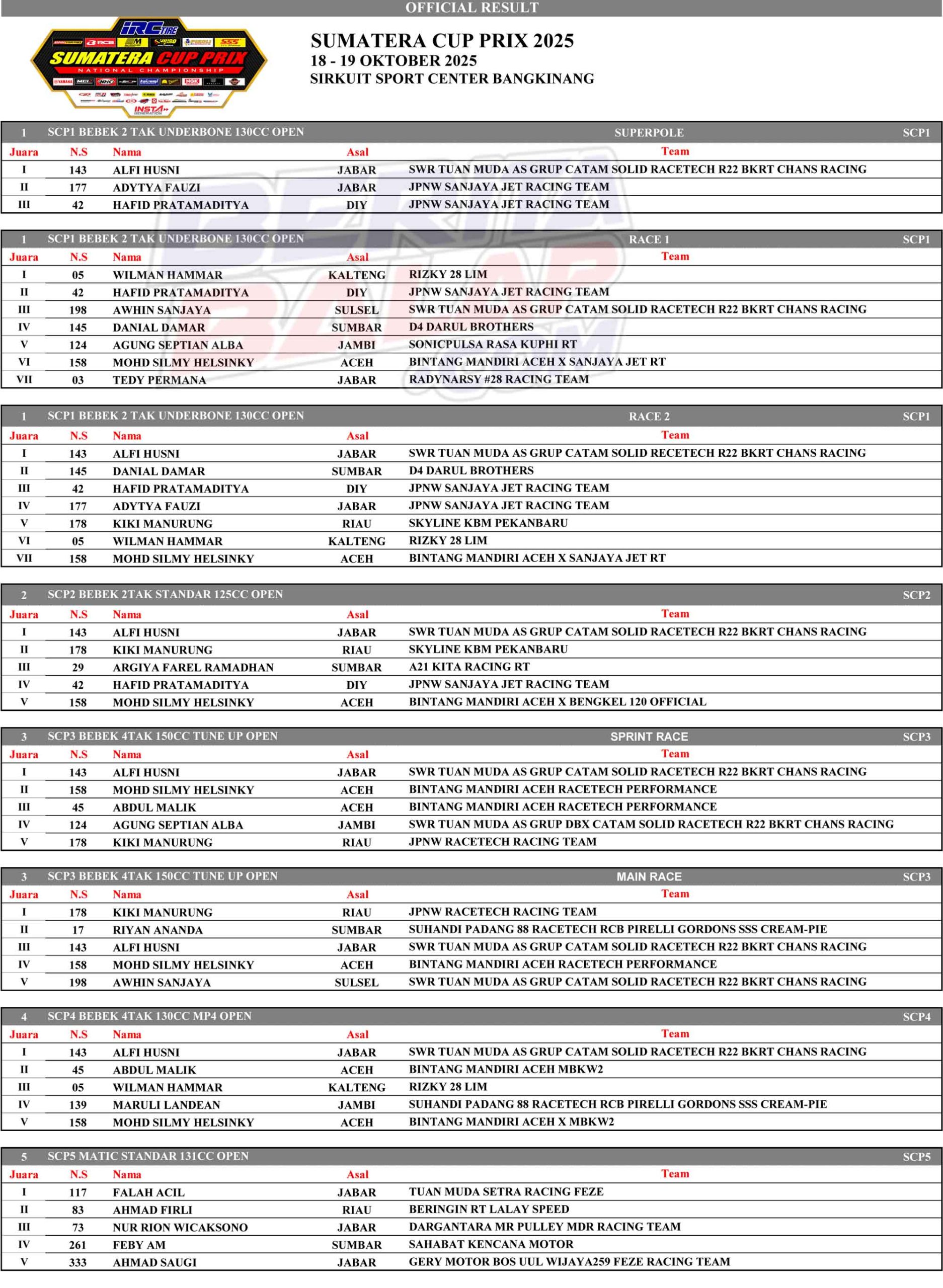 Headline Road Race 19 Oktober, 2025 Hasil Juara SCP 2025 Bangkinang Riau Posted By: BeritaBalap.com Hasil Juara SCP 2025 Bangkinang Riau, Hasil SCP 2025, Hasil SCP 2025 Bangkinang Riau BeritaBalap.com- Berikut ini adalah hasil juara Sumatera Cup Prix (SCP) 2025 yang berlangsung disirkuit Sport Center Bangkinang, Riau (18-19/10). BB1 / Ket FOTO : IG Rizki28lim_racingteam Facebook Comments