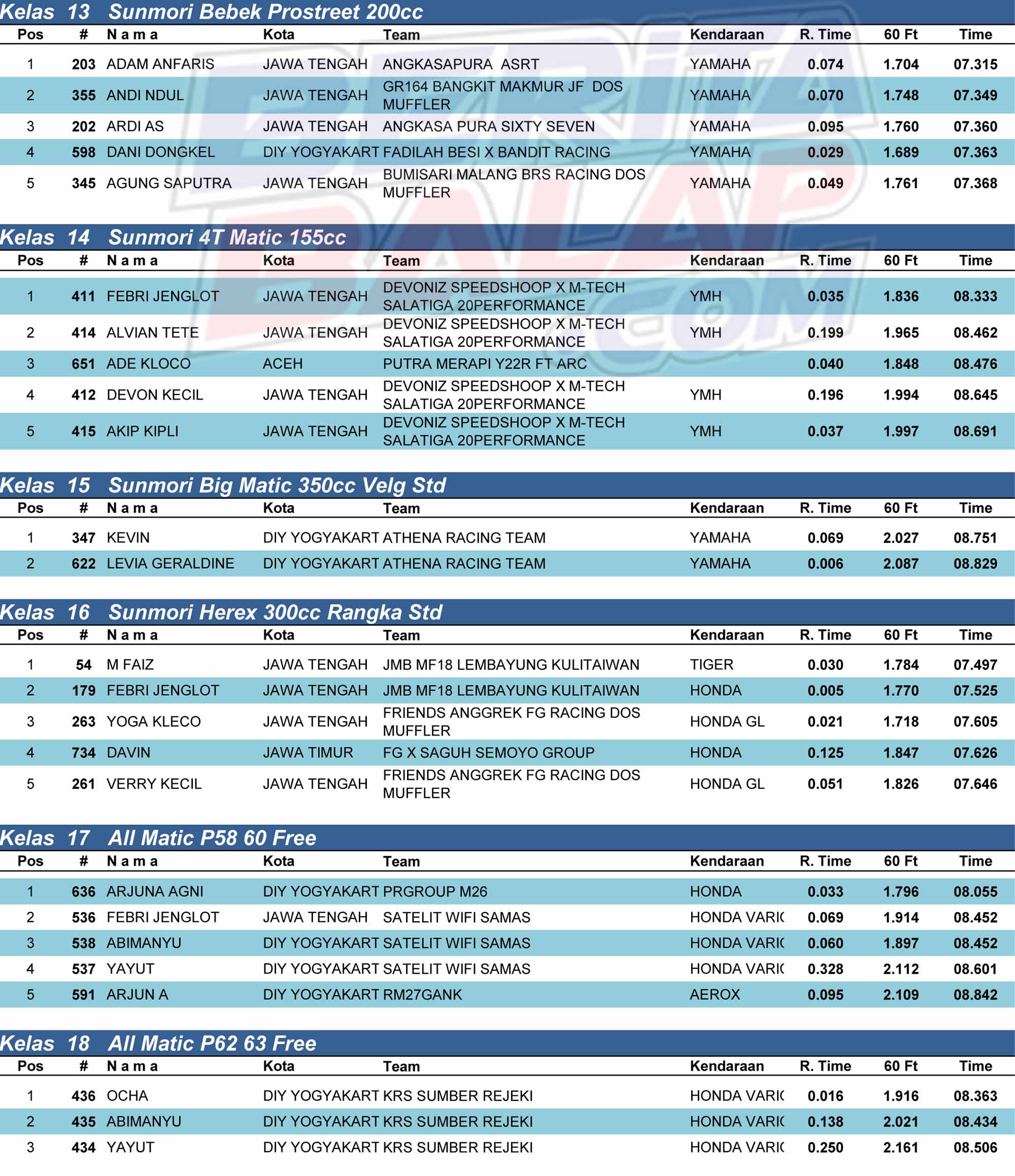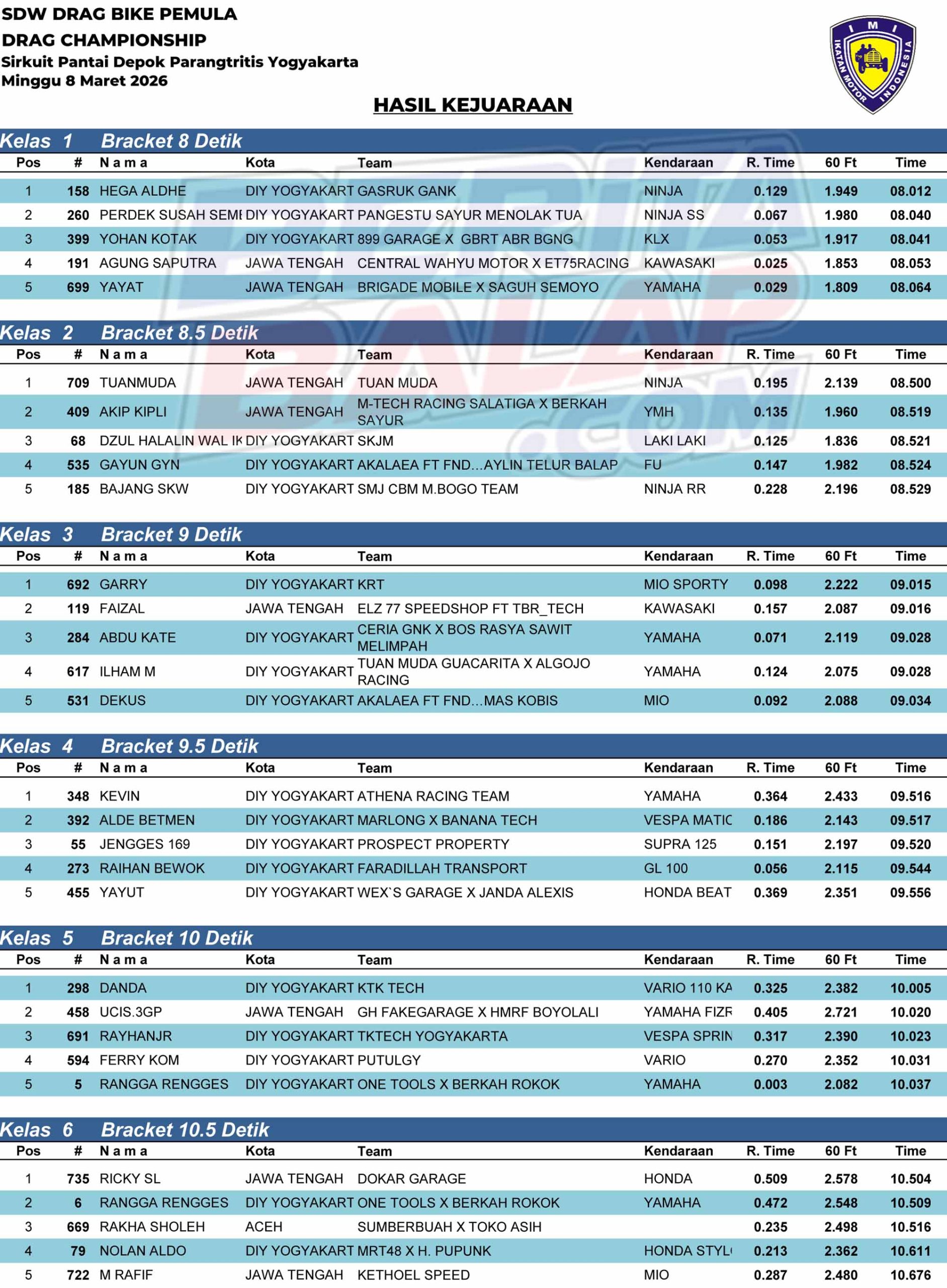 Dragbike Headline 8 Maret, 2026 Hasil Juara SDW Drag Bike Pemula Championship 2026 Pantai Depok Parangtritis Posted By: BeritaBalap.com Hasil Juara SDW Drag Bike Pemula Championship 2026 Pantai Depok Parangtritis, Hasil SDW Drag Bike Pemula Championship 2026 Pantai Depok Parangtritis, SDW Drag Bike Pemula Championship 2026, SDW Drag Bike Pemula Championship 2026 Pantai Depok Parangtritis BeritaBalap.com- Berikut ini adalah hasil juara SDW Drag Bike Pemula Championship 2026 yang berlangsung dilintasan non permanen Pantai Depok Parangtritis, Yogyakarta pada Minggu, 8 Maret. R4NU