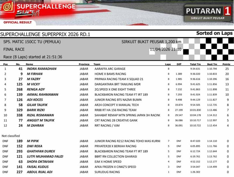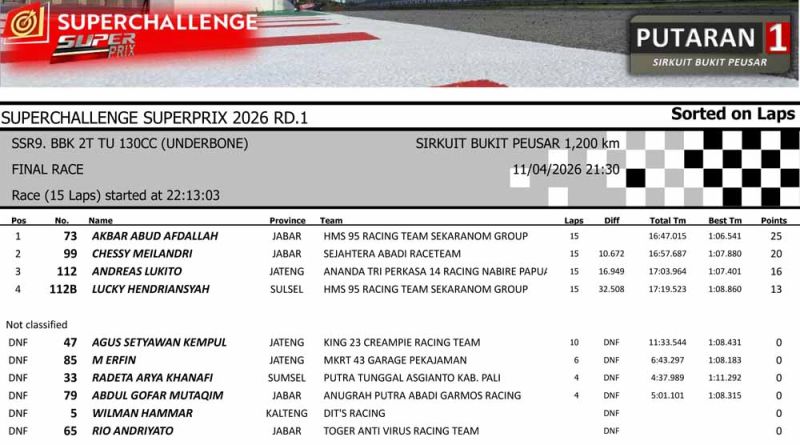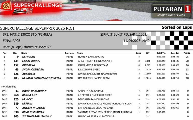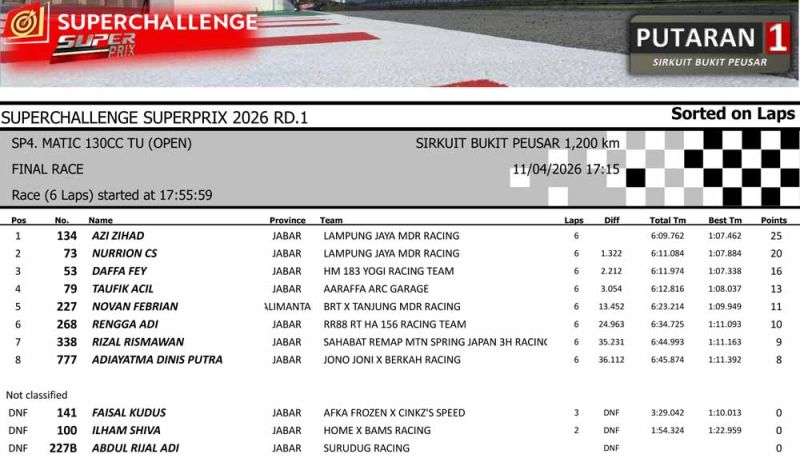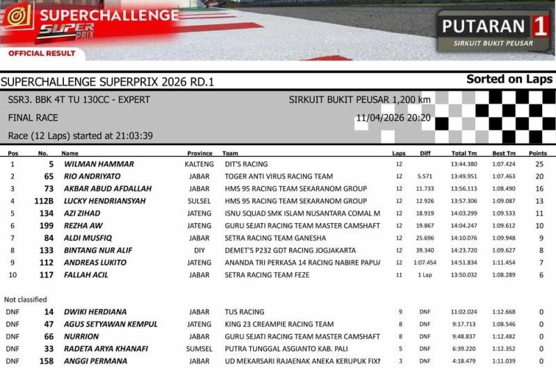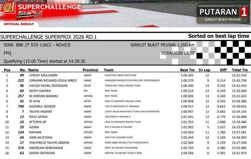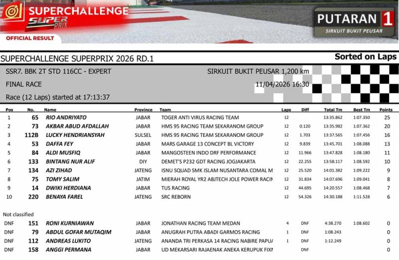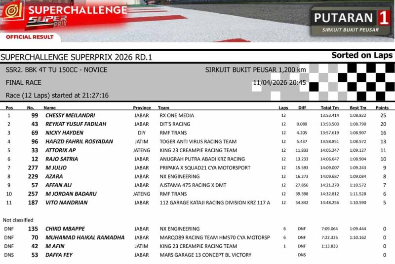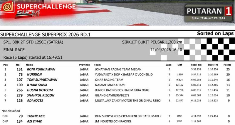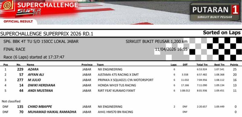 Headline Road Race 11 April, 202612 April, 2026 Hasil Juara Superchallenge Superprix 2026 Tasikmalaya Posted By: BeritaBalap.com Hasil Juara Superchallenge Superprix 2026 Tasikmalaya, Hasil Superchallenge Superprix 2026 Tasikmalaya, Hasil Superprix 2026 BeritaBalap.com- Berikut ini adalah hasil juara Superchallenge Superprix 2026 yang berlangsung dilintasan Bukit Peusar, Tasikmalaya (11-12/4). Edhot