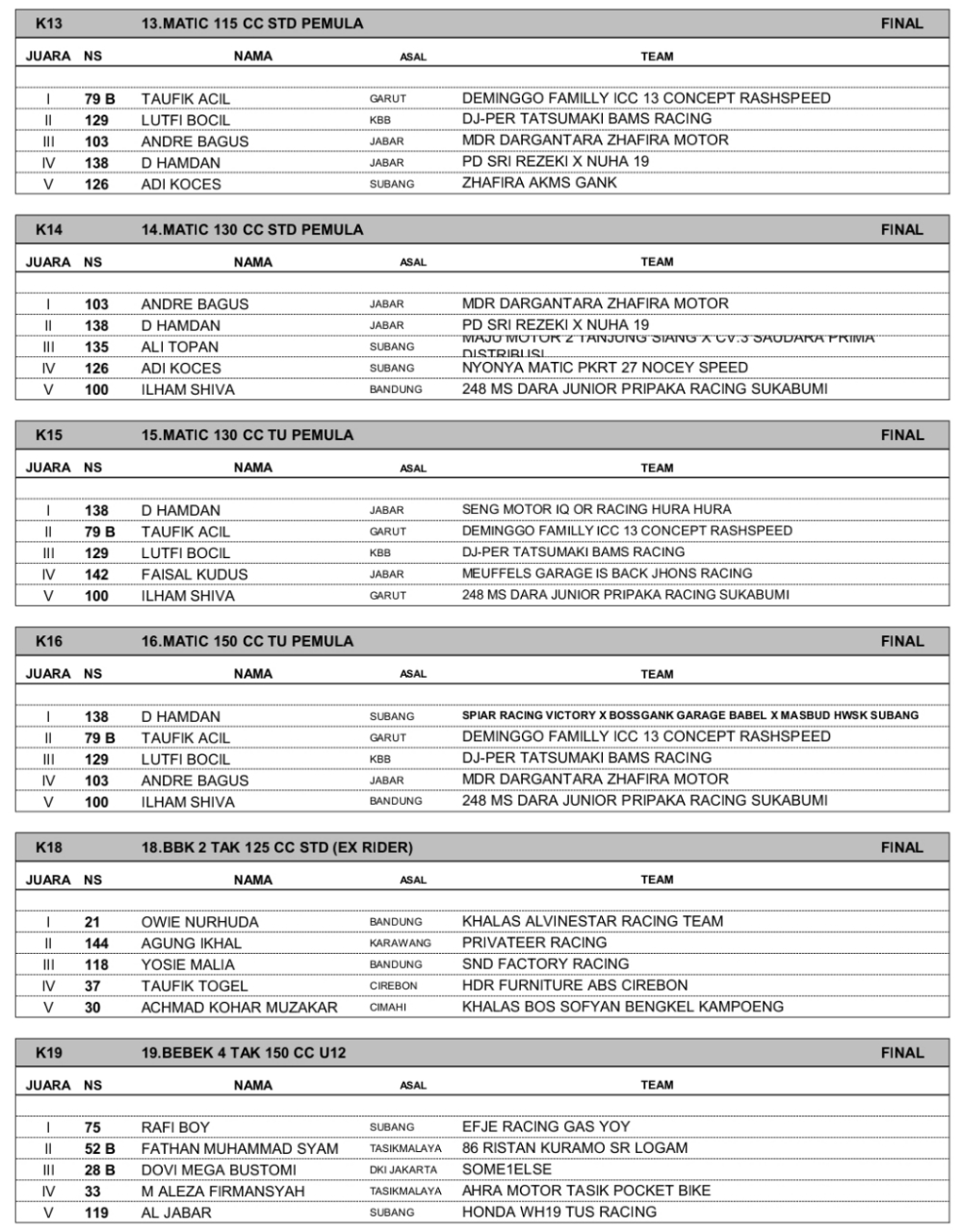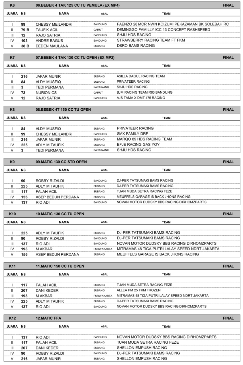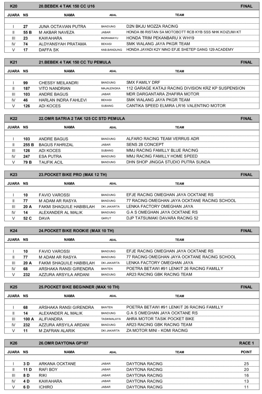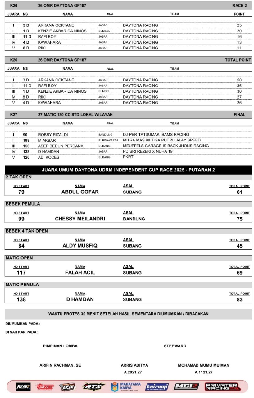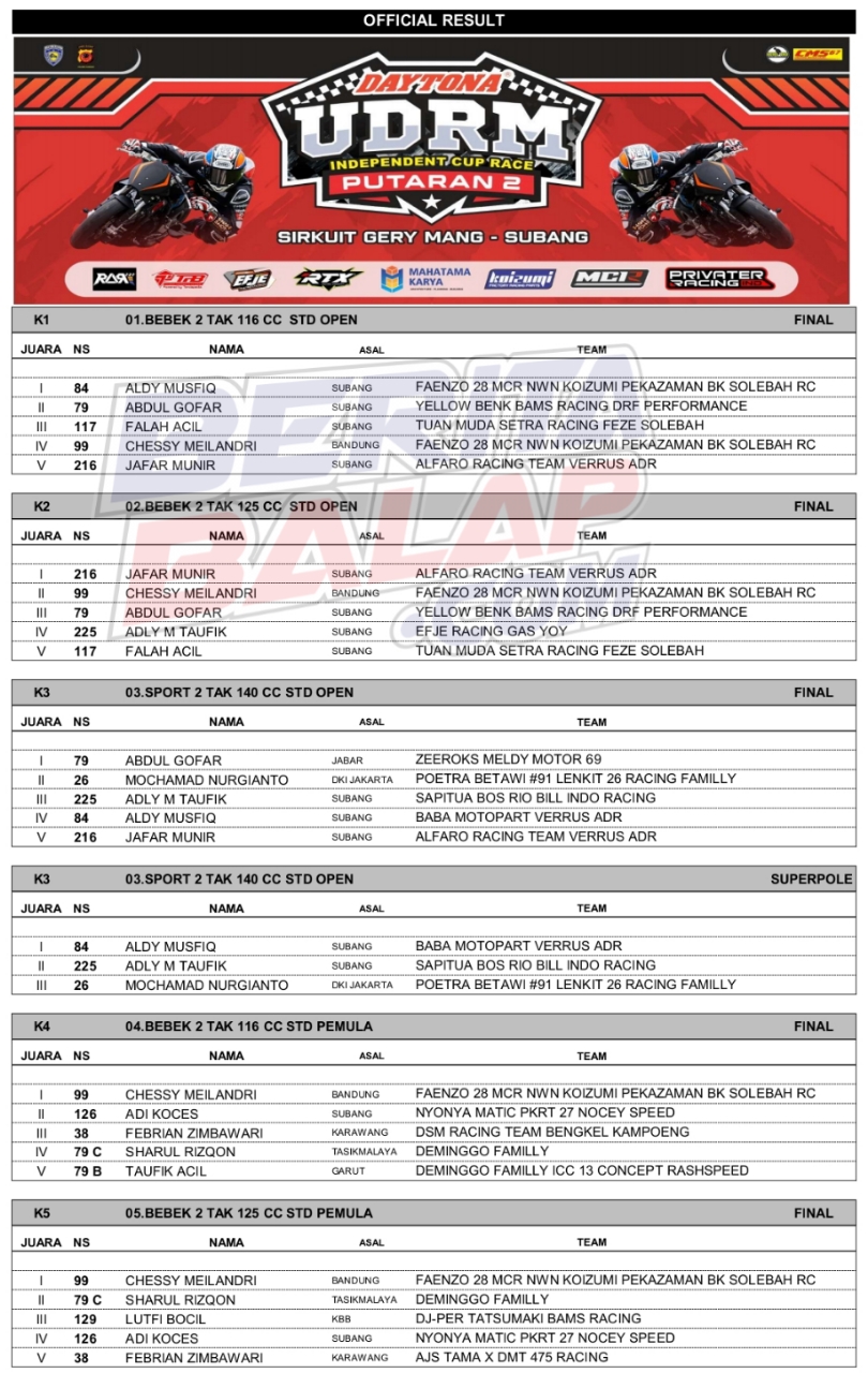 Headline Road Race 26 Oktober, 202526 Oktober, 2025 Hasil Juara UDRM Independent Cup Race 2025 Subang Posted By: BeritaBalap.com Hasil UDRM Independent Cup Race 2025, Hasil UDRM Independent Cup Race 2025 Subang, UDRM Independent Cup Race 2025 BeritaBalap.com- Berikut ini adalah hasil juara UDRM Independent Cup Race 2025 putaran 2 yang berlangsung di sirkuit Gery Mang, Subang (25-26/10). Edhot Facebook Comments