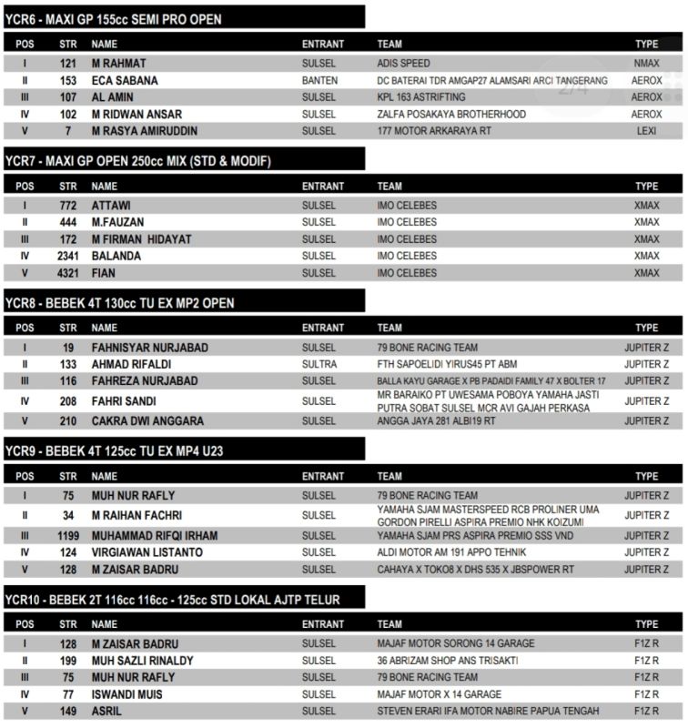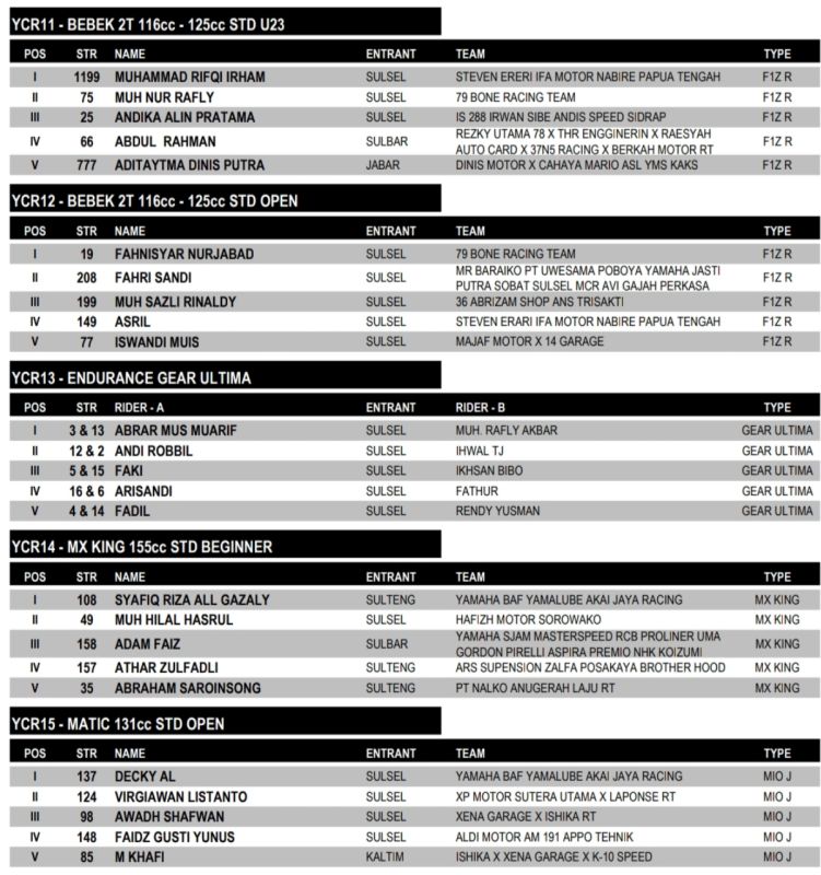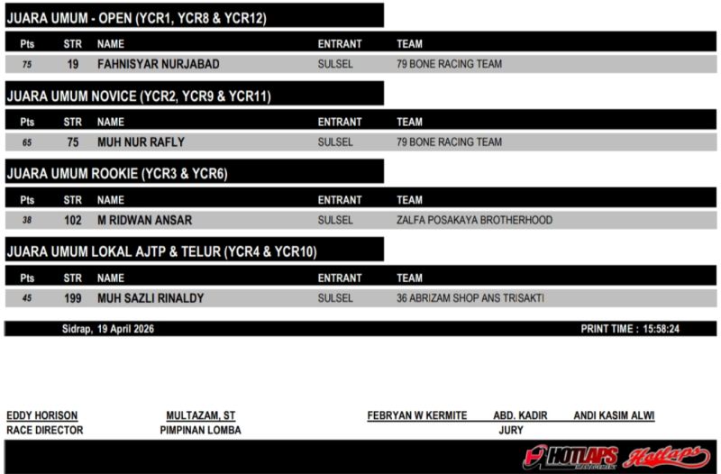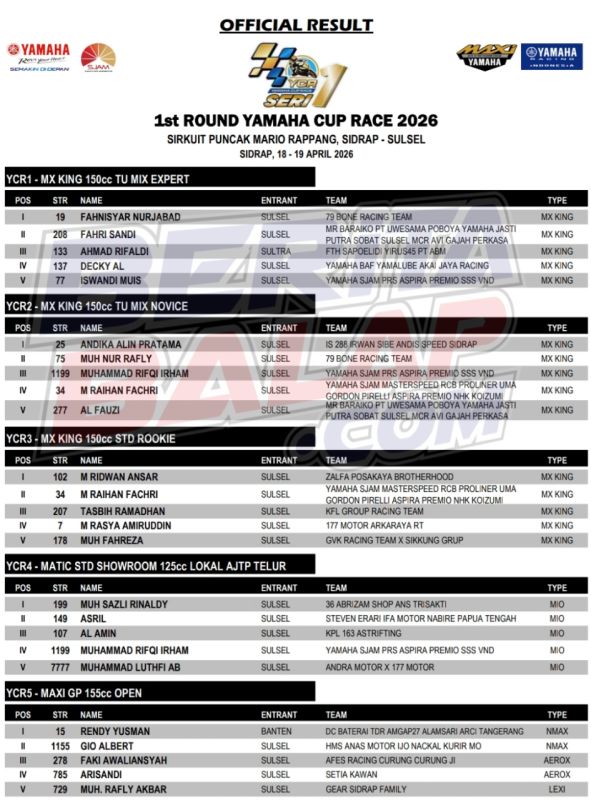 Headline Road Race 19 April, 202619 April, 2026 Hasil Juara YCR 2026 Sidrap (Minggu) Posted By: BeritaBalap.com Hasil Juara YCR 2026 Sidrap, Hasil Juara YCR 2026 Sidrap (Minggu), Hasil YCR 2026 Sidrap (Minggu) BeritaBalap.com- Berikut ini adalah hasil juara Yamaha Cup Race (YCR) 2026 seri pembuka yang berlangsung dilinatasan Puncak Mario, Sidrap, Sulawesi Selatan pada Minggu, 19 April. BB1