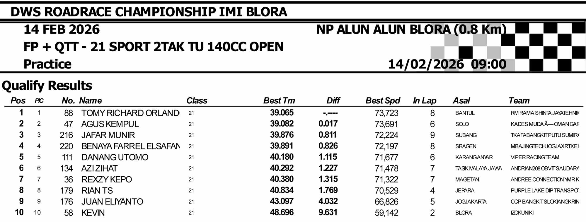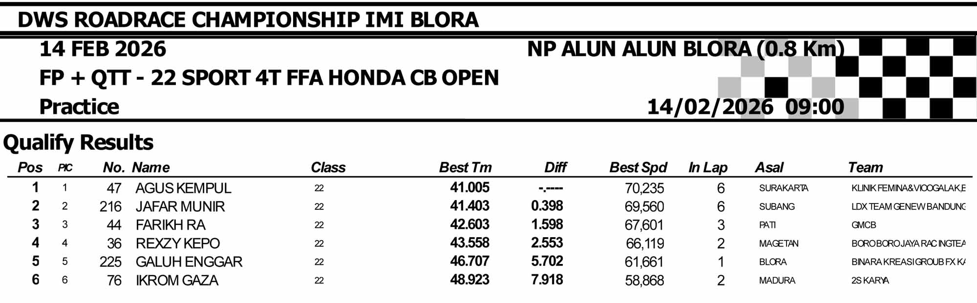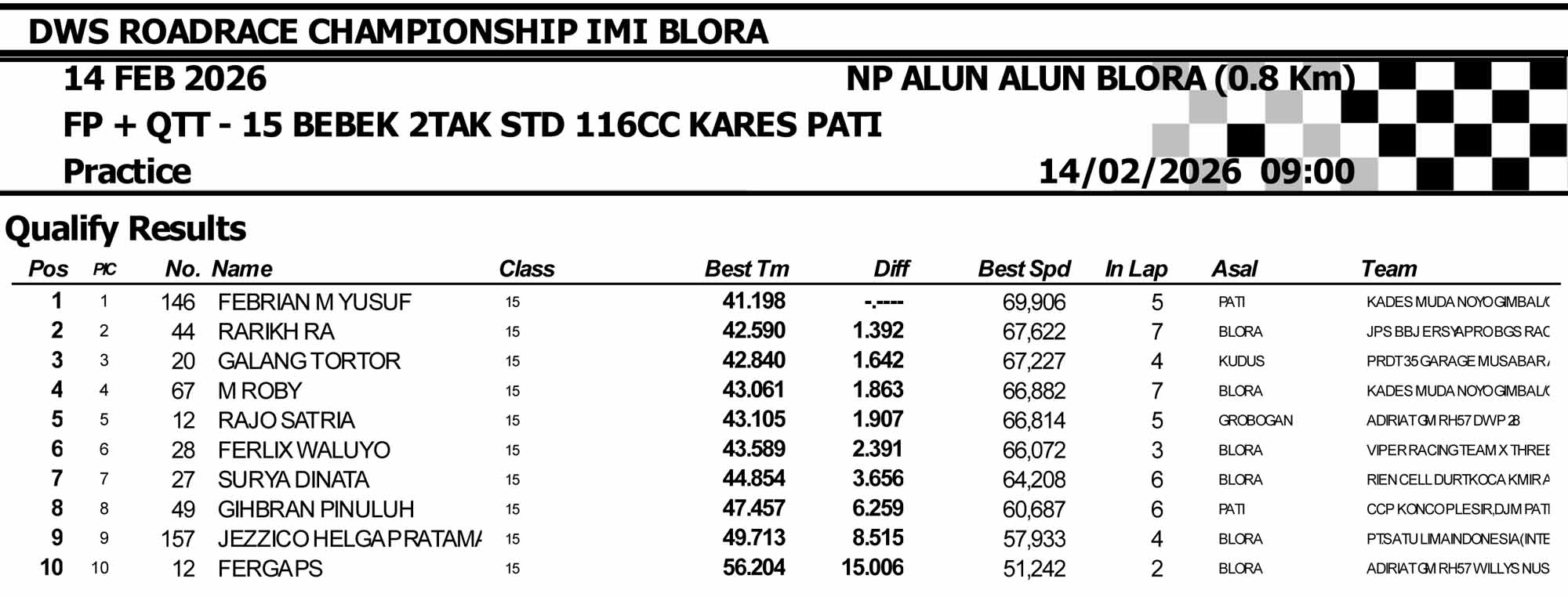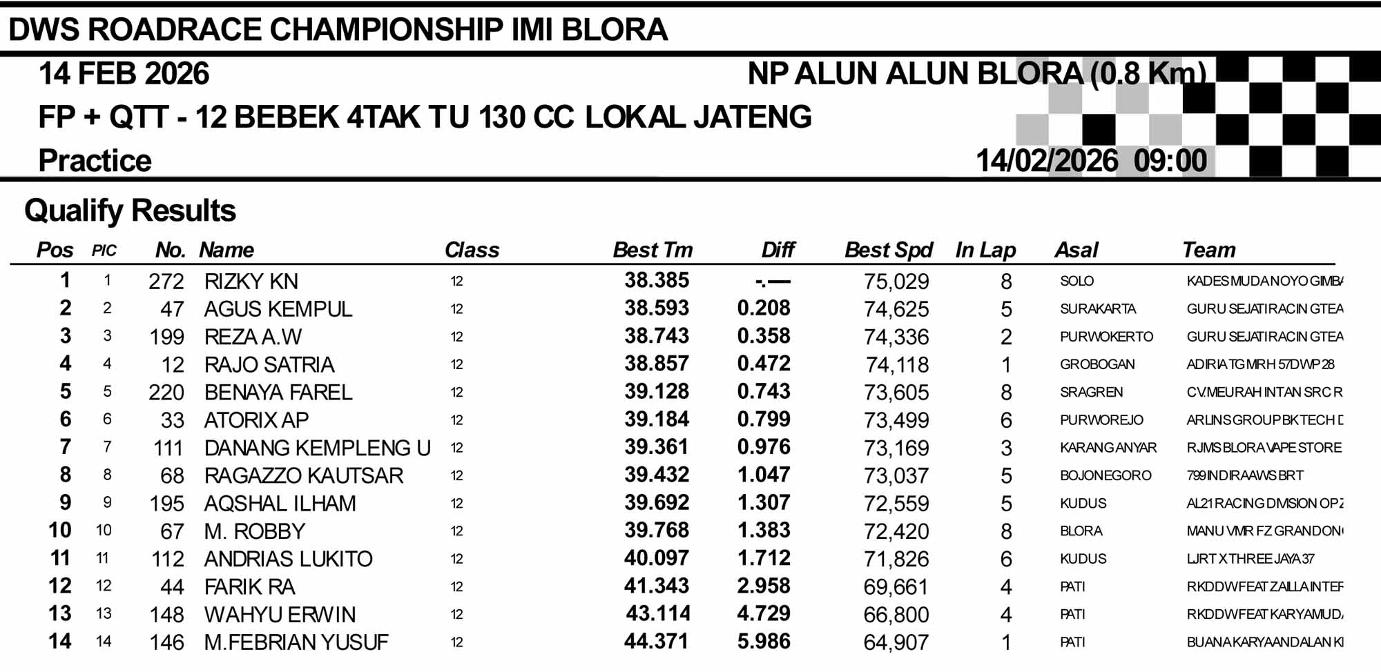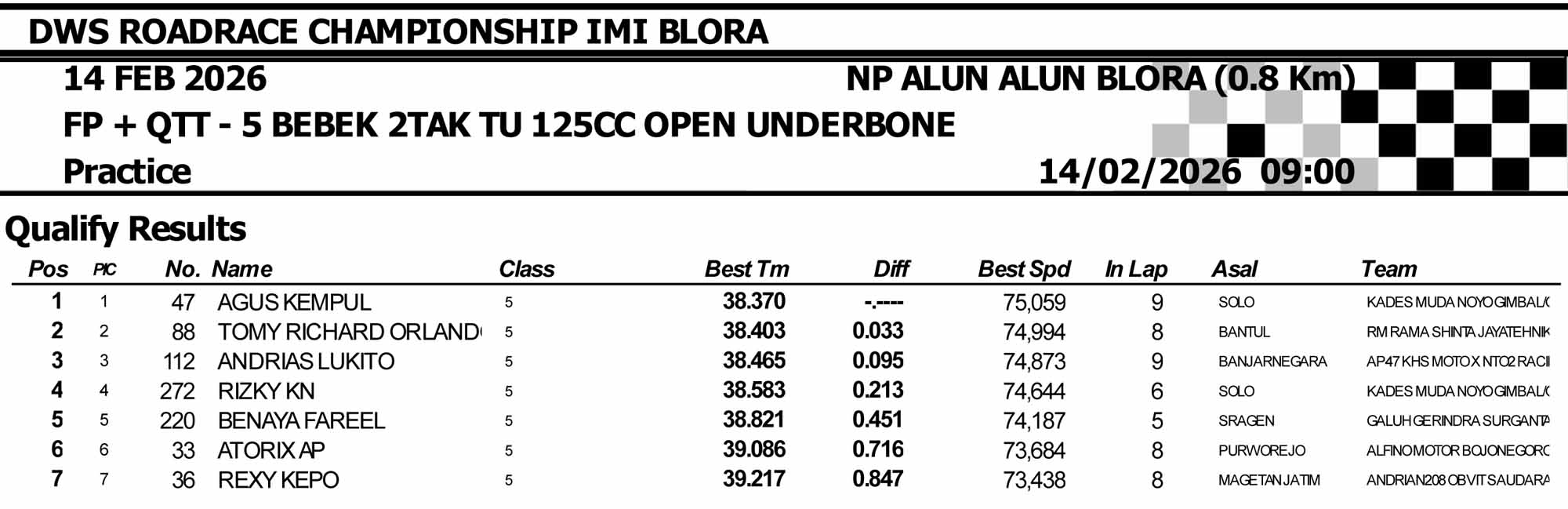 Headline Road Race 14 Februari, 2026 Hasil Kualifikasi DWS Road Race Championship 2026 Blora Posted By: BeritaBalap.com DWS Road Race Championship 2026 Blora, Hasil DWS Road Race Championship 2026 Blora, Hasil Kualifikasi DWS Road Race Championship 2026 Blora BeritaBalap.com- Berikut ini adalah hasil kualifikasi DWS Road Race Championship 2026 yang ber;angsunh dilintasan NP Alun-Alun Blora pada Sabtu, 14 Februari. R4NU