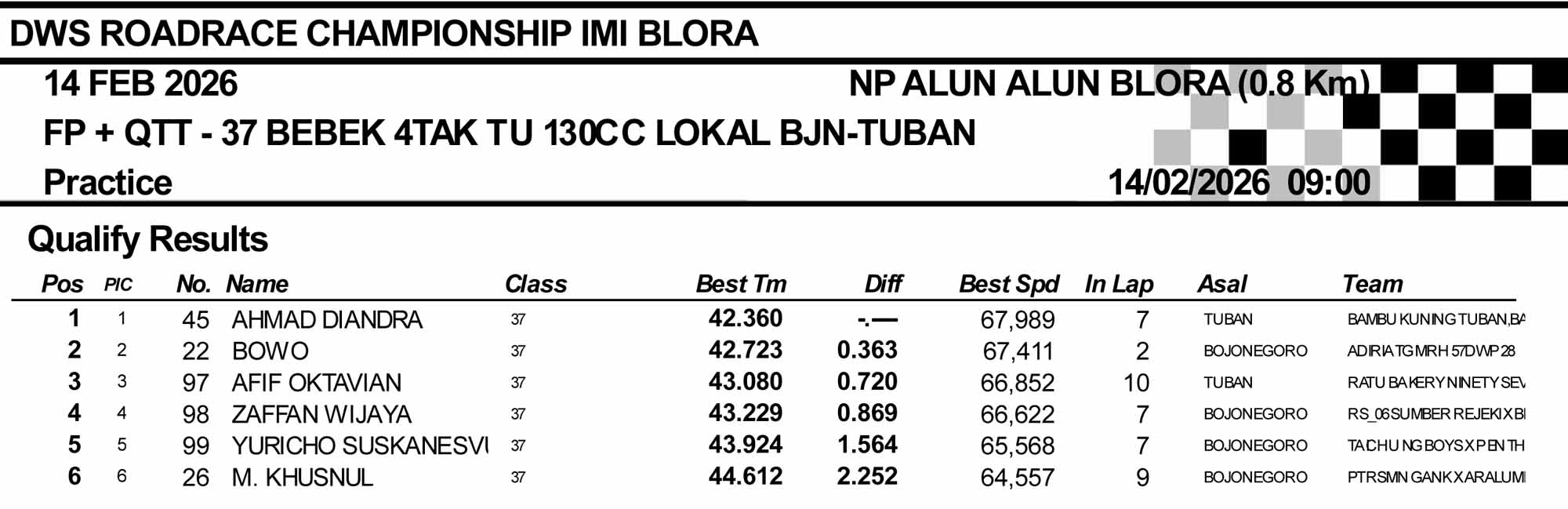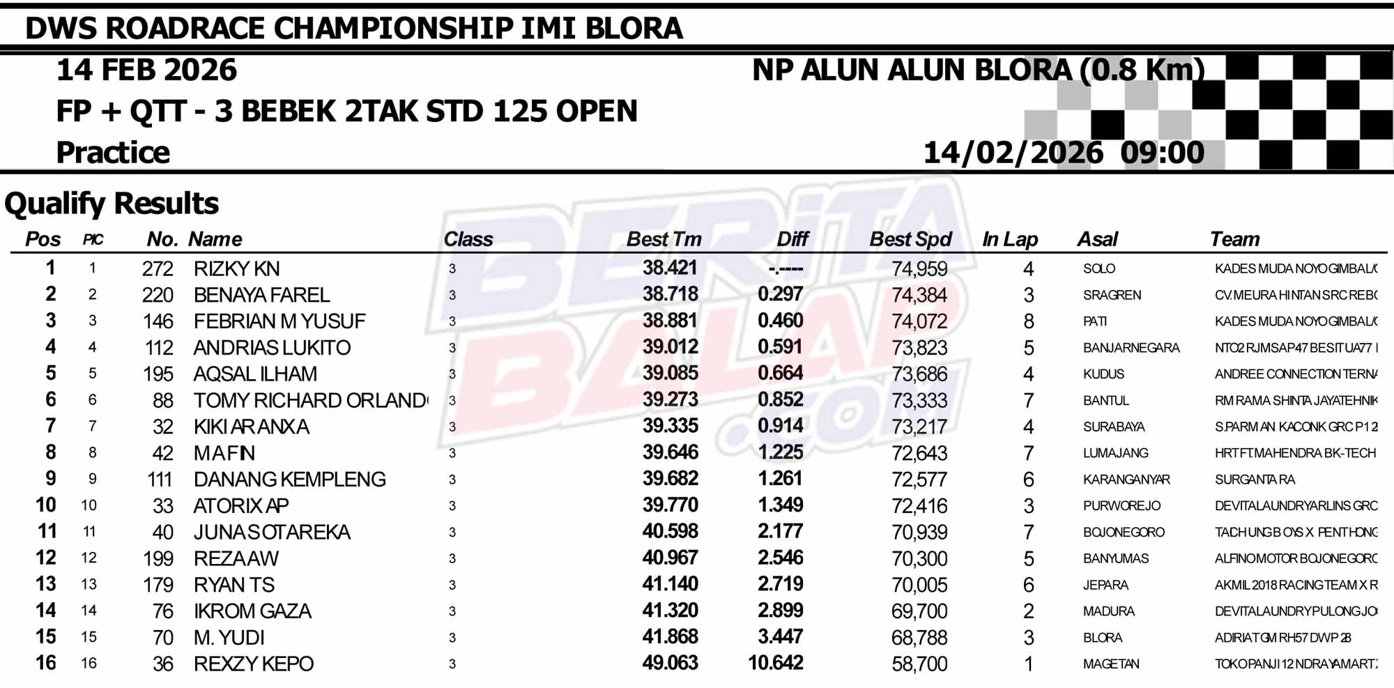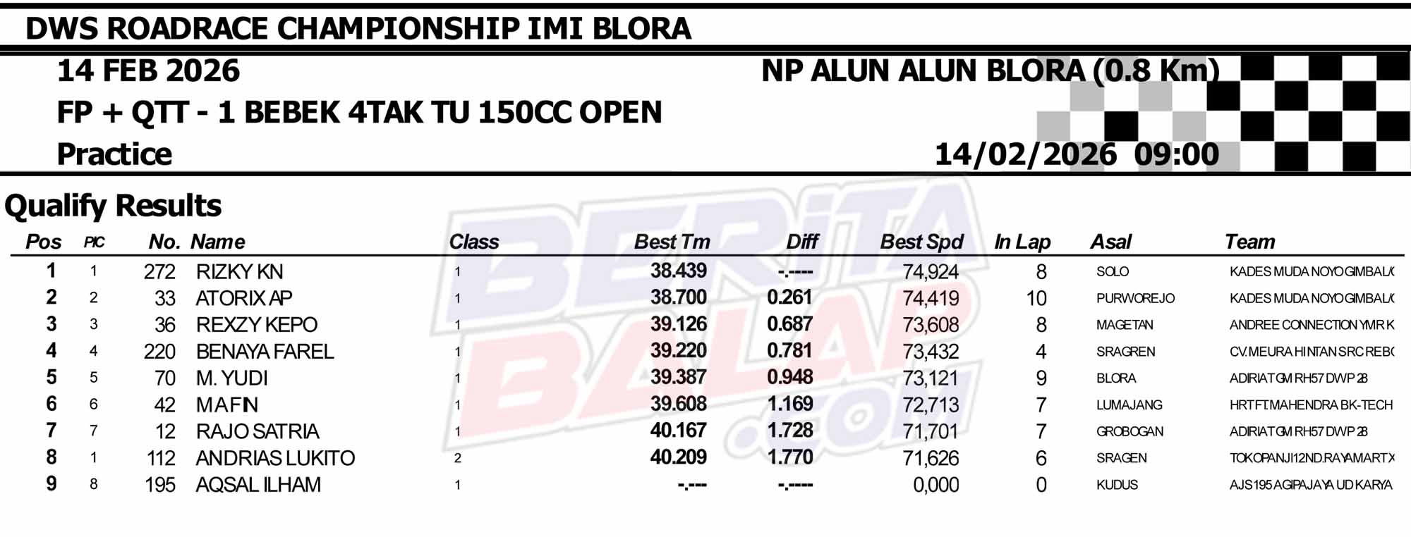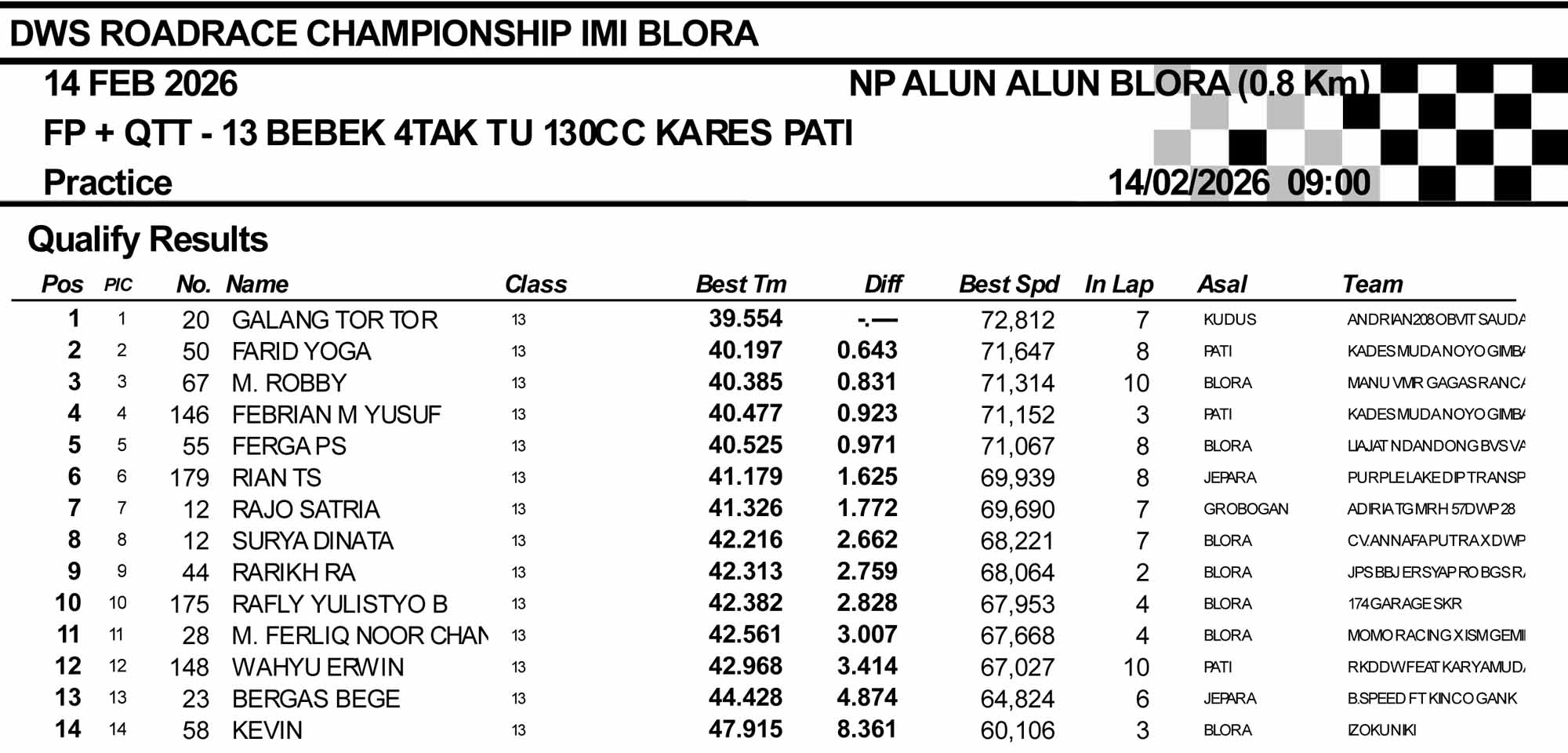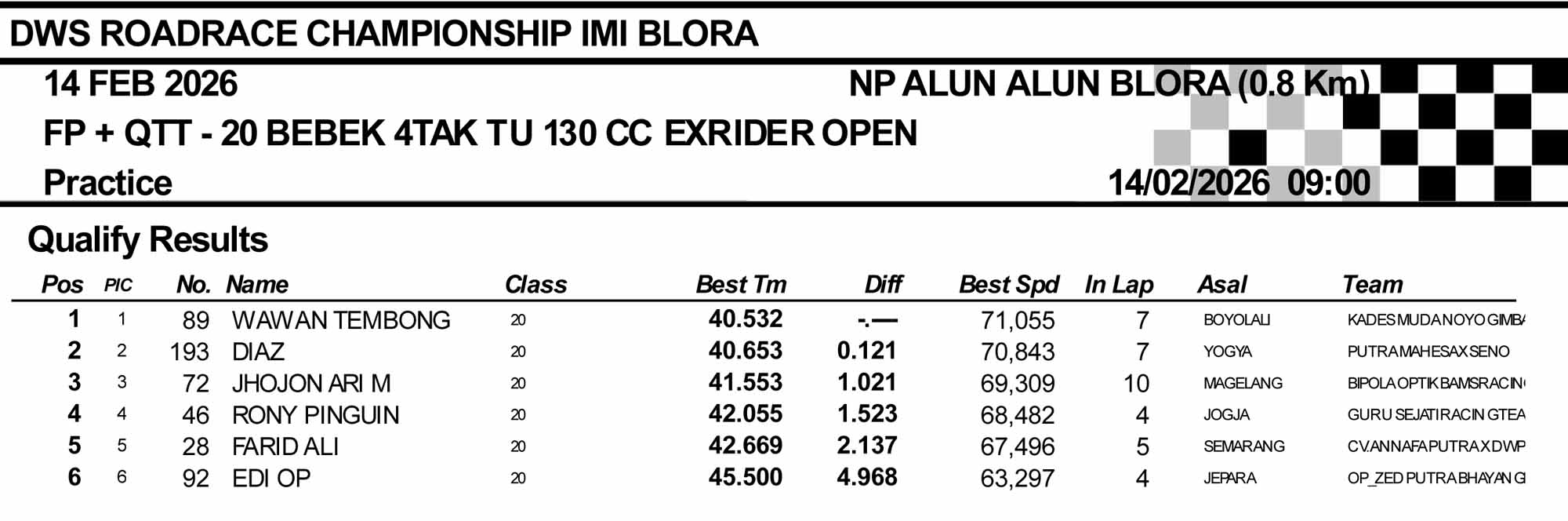 Headline Road Race 14 Februari, 2026 Hasil Kualifikasi DWS Road Race Championship 2026 Blora Posted By: BeritaBalap.com DWS Road Race Championship 2026 Blora, Hasil DWS Road Race Championship 2026 Blora, Hasil Kualifikasi DWS Road Race Championship 2026 Blora BeritaBalap.com- Berikut ini adalah hasil kualifikasi DWS Road Race Championship 2026 yang ber;angsunh dilintasan NP Alun-Alun Blora pada Sabtu, 14 Februari. R4NU