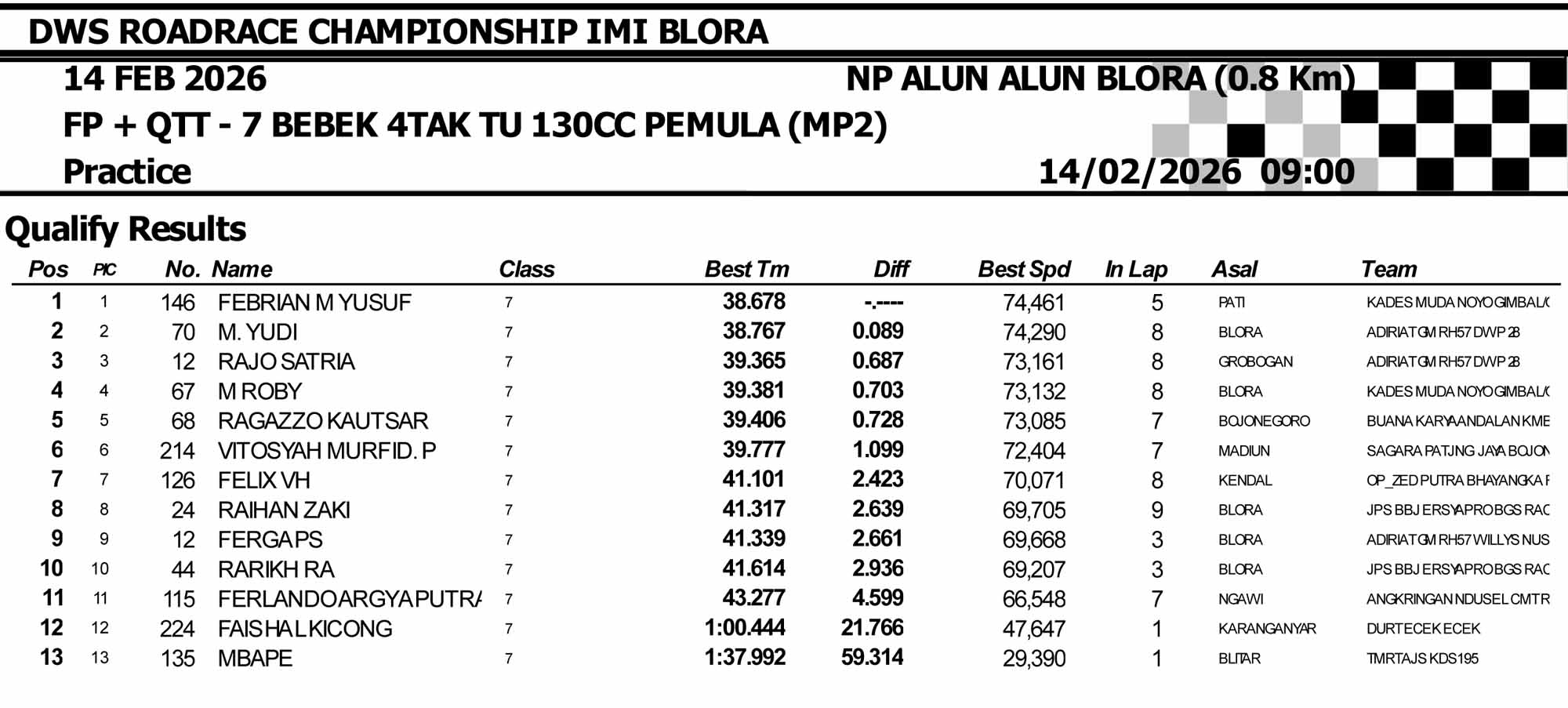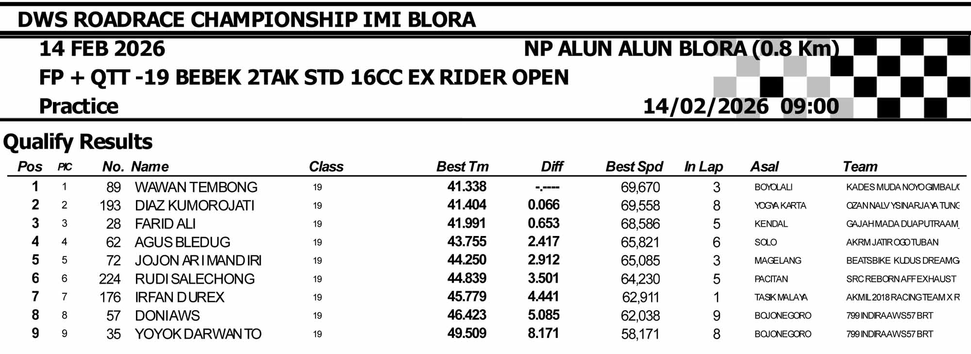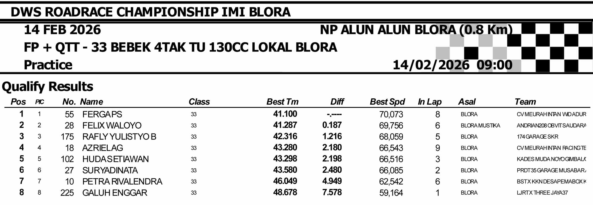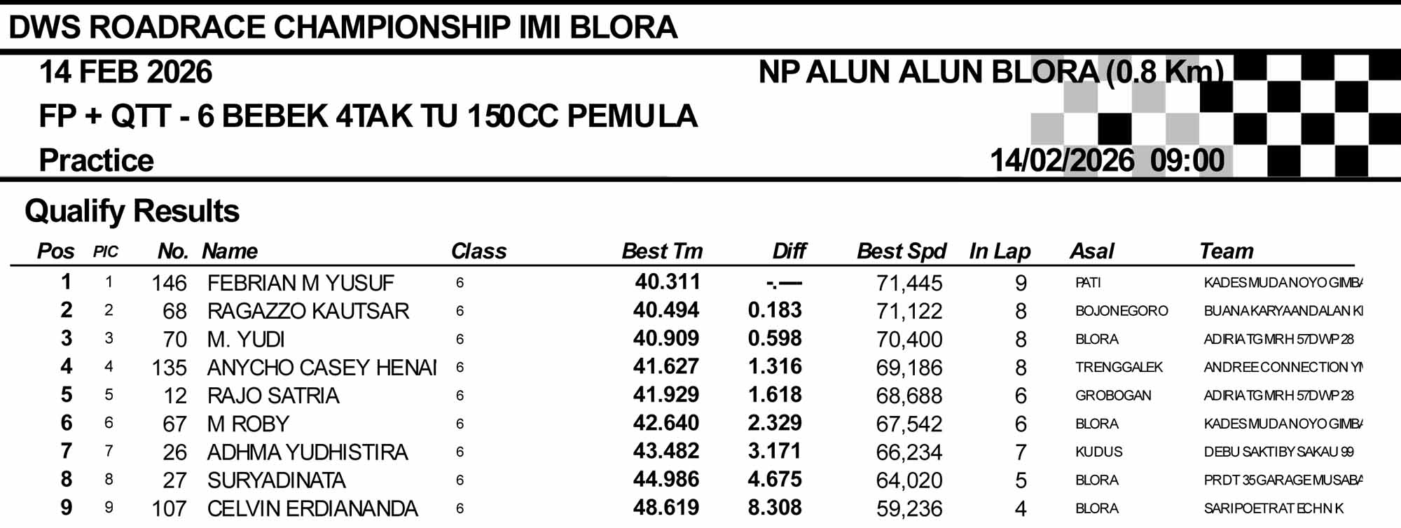 Headline Road Race 14 Februari, 2026 Hasil Kualifikasi DWS Road Race Championship 2026 Blora Posted By: BeritaBalap.com DWS Road Race Championship 2026 Blora, Hasil DWS Road Race Championship 2026 Blora, Hasil Kualifikasi DWS Road Race Championship 2026 Blora BeritaBalap.com- Berikut ini adalah hasil kualifikasi DWS Road Race Championship 2026 yang ber;angsunh dilintasan NP Alun-Alun Blora pada Sabtu, 14 Februari. R4NU